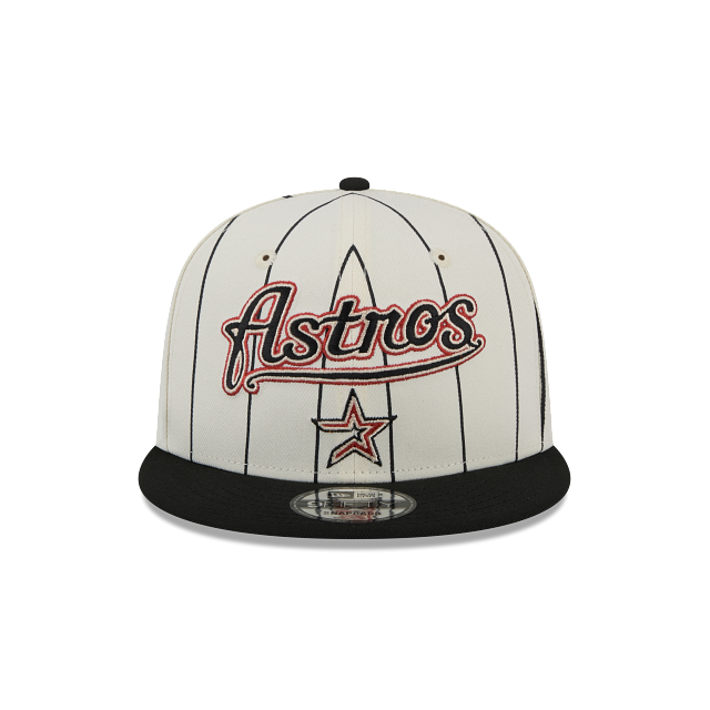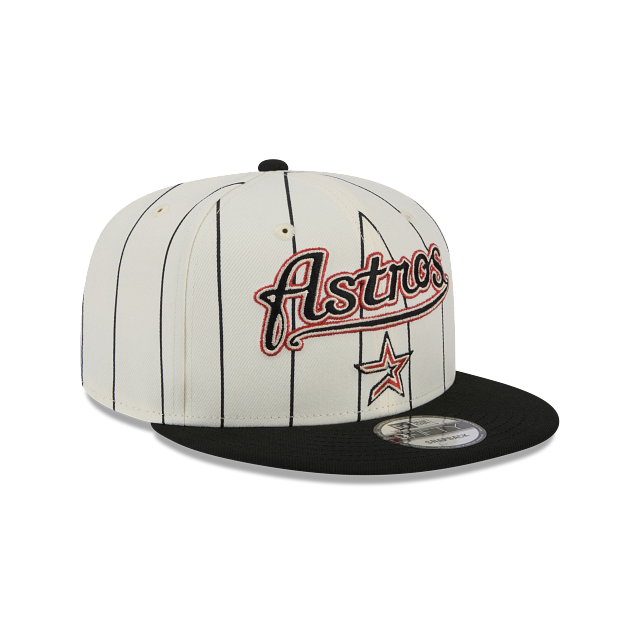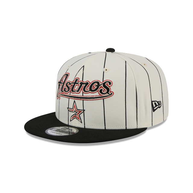 Esta gorra New Era 9FIFTY de Houston Astros de la colección exclusiva de la tienda en línea MLB Jersey Pinstripe presenta un diseño blanco con líneas verticales estilo jersey pinstripe con el logotipo retro y el nombre de los Astros bordado en los paneles frontales, undervisor verde y el flag de New Era bordado en el lado izquierdo. Luce con estilo y cómprala ya.