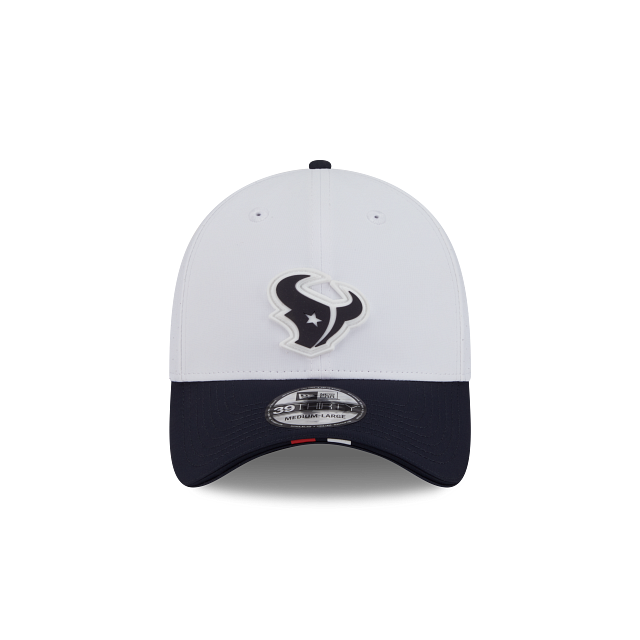 Esta gorra curva New Era 39THIRTY de Houston Texans de la colección NFL Training 2025 presenta una corona en color blanco con el logotipo de los Texans engomado en los paneles frontales, el logo de la NFL al reverso y el flag de New Era engomado del lado izquierdo. Apoya a tu equipo y cómprala ya.