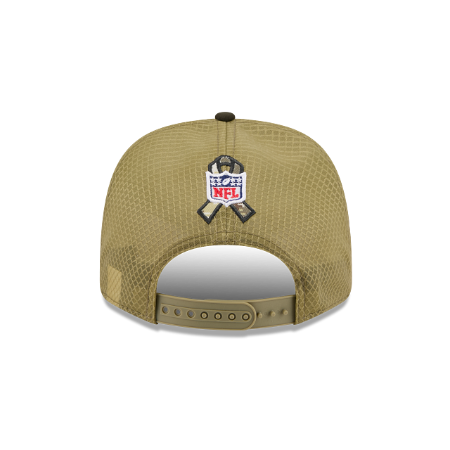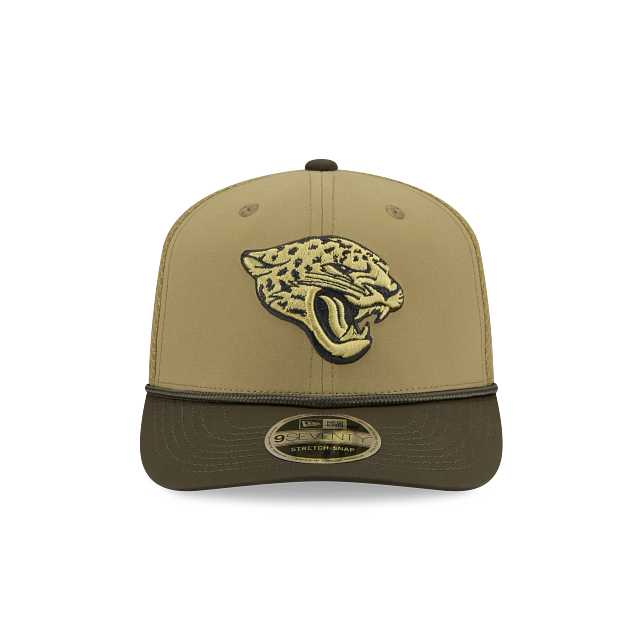 Esta gorra curva New Era 9SEVENTY Stretch Snap de Jacksonville Jaguars de la colección NFL Salute to Service 2025 presenta un diseño en color verde con el logotipo de los Jaguars bordado en los paneles frontales, la bandera de Estados Unidos del lado derecho, malla trucker y el logo de la NFL en la parte de atrás, el logo del equipo en el undervisor y el flag de New Era bordado del lado izquierdo. Cómprala ya.