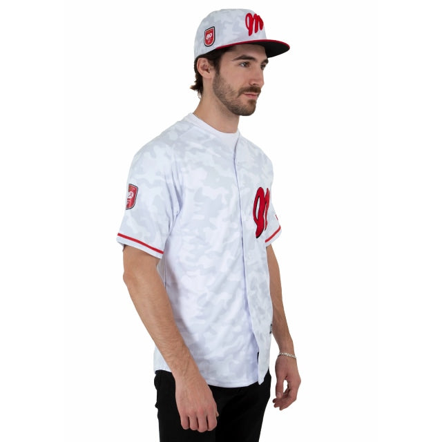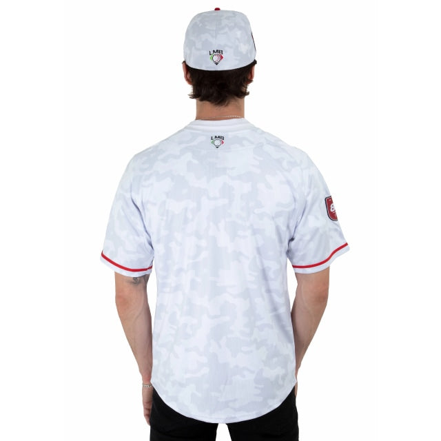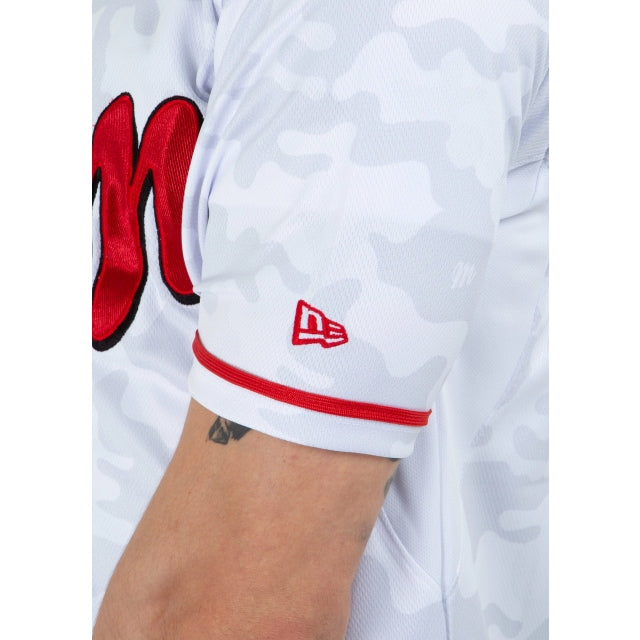 Jersey New Era con arte en el pecho del equipo aplicado en tela, parche de estilo flexible con el logo de la liga y terminado con el bordado directo de la bandera de New Era en la manga izquierda.