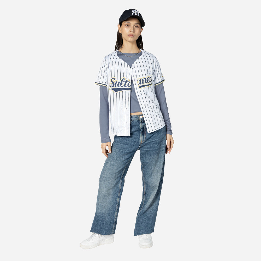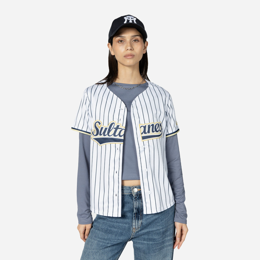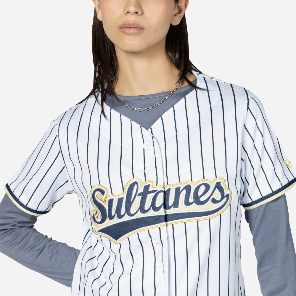 Este Jersey New Era para Mujer de Sultanes de Monterrey de la colección LMB Jerseys presenta un diseño a rayas con el nombre de los Sultanes bordado en la parte frontal y el flag de New Era bordado en la manga izquierda. Apoya a tu equipo y cómpralo ya.