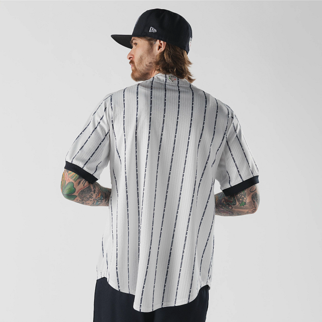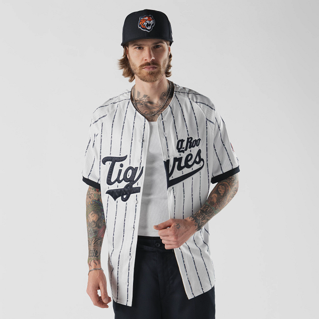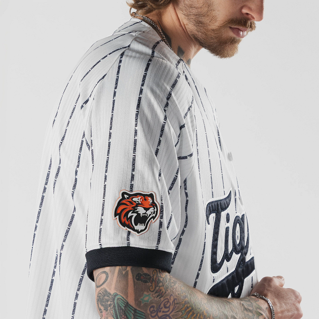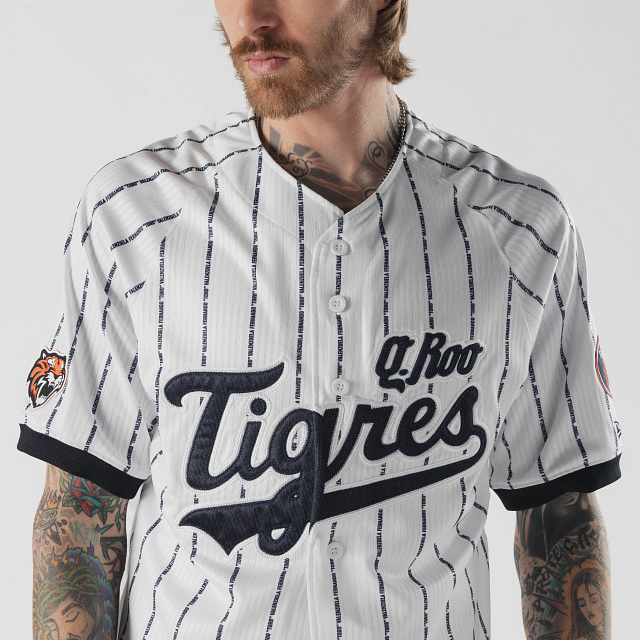 Apoya a tu equipo en esta temporada 2026 con el Jersey New Era de Tigres de Quintana Roo de local de corte regular que ofrece un ajuste cómodo y clásico, fiel a la talla. Presenta un diseño pinstripe en tela jacquard, Q.Roo Tigres bordado en la parte frontal, la frase El Equipo que Nació Campeón en el interior del cuello, logo de la LMB en la parte de atrás, parche del logo del equipo en la manga derecha, parche Valenzuela y el flag de New Era bordado en la manga izquierda. Cómpralo ya.