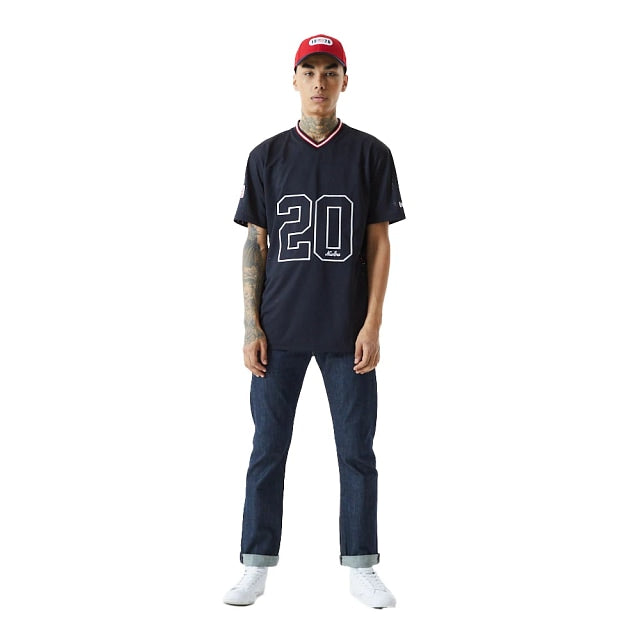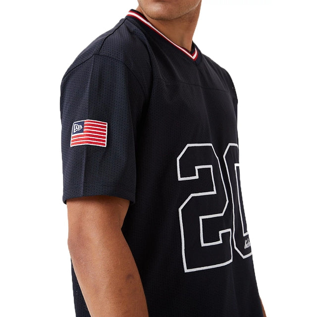 Playera oversized 100% poliéster con aplicación grande de la fecha EST. en el pecho. Con bordado de la bandera estadounidense en la manga derecha y canalé de rayas en el cuello. Terminado con el bordado directo de la bandera de New Era en la manga izquierda.