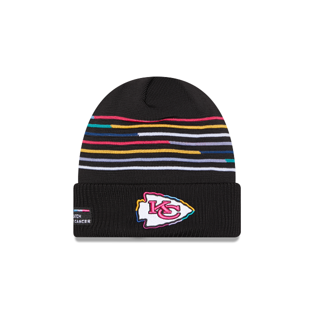 Este gorrito New Era de Kansas City Chiefs de la colección NFL Crucial Catch 2025 presenta un diseño en color negro con franjas de colores en la parte superior, el logotipo de los Chiefs bordado en la parte frontal, parche Crucial Catch Intercept Cancer del lado derecho, el logo de la NFL en la parte de atrás y el flag de New Era bordado el lado izquierdo. Cómpralo ya.