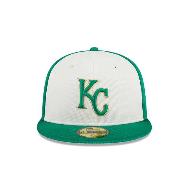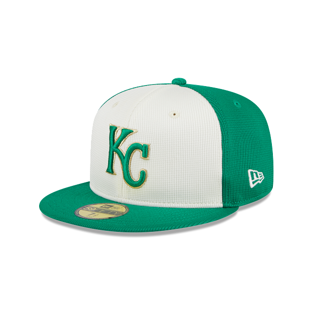 Esta gorra New Era 59FIFTY de Kansas City Royals de la colección MLB St. Patrick's Day 2024 presenta el logotipo de los Royals con contorno dorado bordado en los paneles frontales en color blanco que contrasta con el clásico verde de la celebración, el MLB Batterman al reverso y el flag de New Era bordado en el lado izquierdo. Cómprala ya.