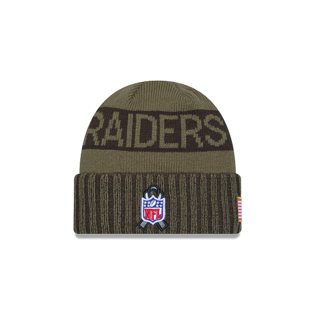 Este gorrito New Era de Las Vegas Raiders de la colección NFL Salute to Service 2025 presenta el logotipo de los Raiders bordado en la parte frontal, el nombre del equipo en la parte superior, la bandera de Estados Unidos en la parte derecha, el logo de la NFL en la parte de atrás y el flag de New Era bordado del lado izquierdo. Cómprala ya.