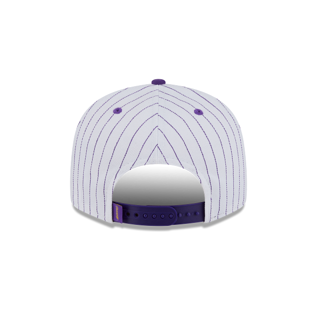 Esta gorra plana New Era 9FIFTY de Los Angeles Lakers de la colección NBA Deceptor presenta un diseño pinstripe con la inicial de los Lakers junto con su logotipo bordado en los paneles frontales, el logo del equipo del lado derecho y el flag de New Era bordado del lado izquierdo. Cómprala ya.