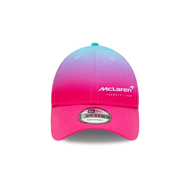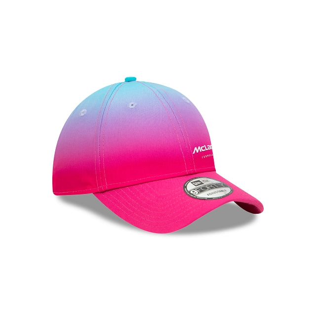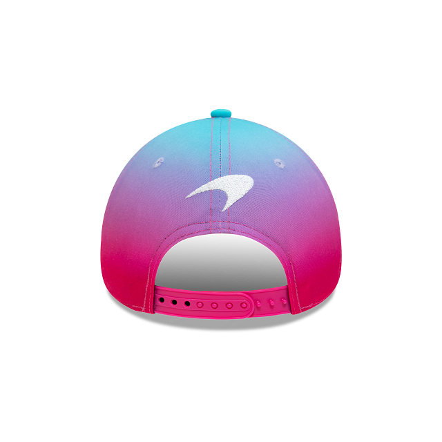Esta gorra 9FORTY de McLaren Racing Miami GP presenta el logotipo de la escudería británica al frente a la izquierda y un logo de la escudería en la parte trasera sobre un diseño fade en tonos azules y rosas. Apoya a tu escudería y cómprala ya.