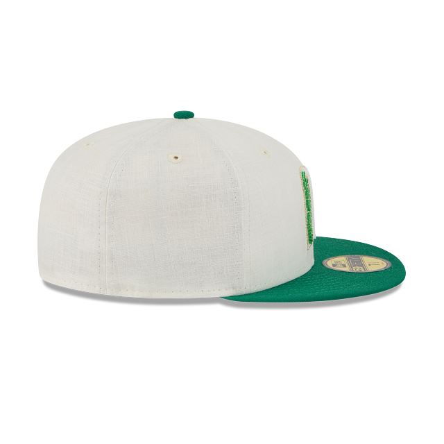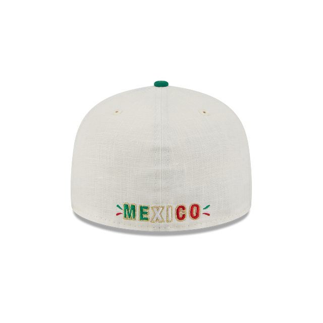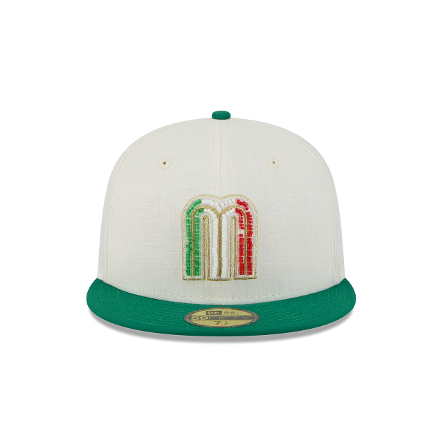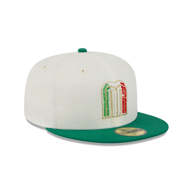 Esta gorra plana New Era 59FIFTY de la colección Beaded Linen presenta un diseño en lino inspirado en los colores patrios con la icónica M de México rellena de cuentas en los paneles frontales, México bordado al reverso y el flag de New Era bordado del lado izquierdo. Cómprala ya.