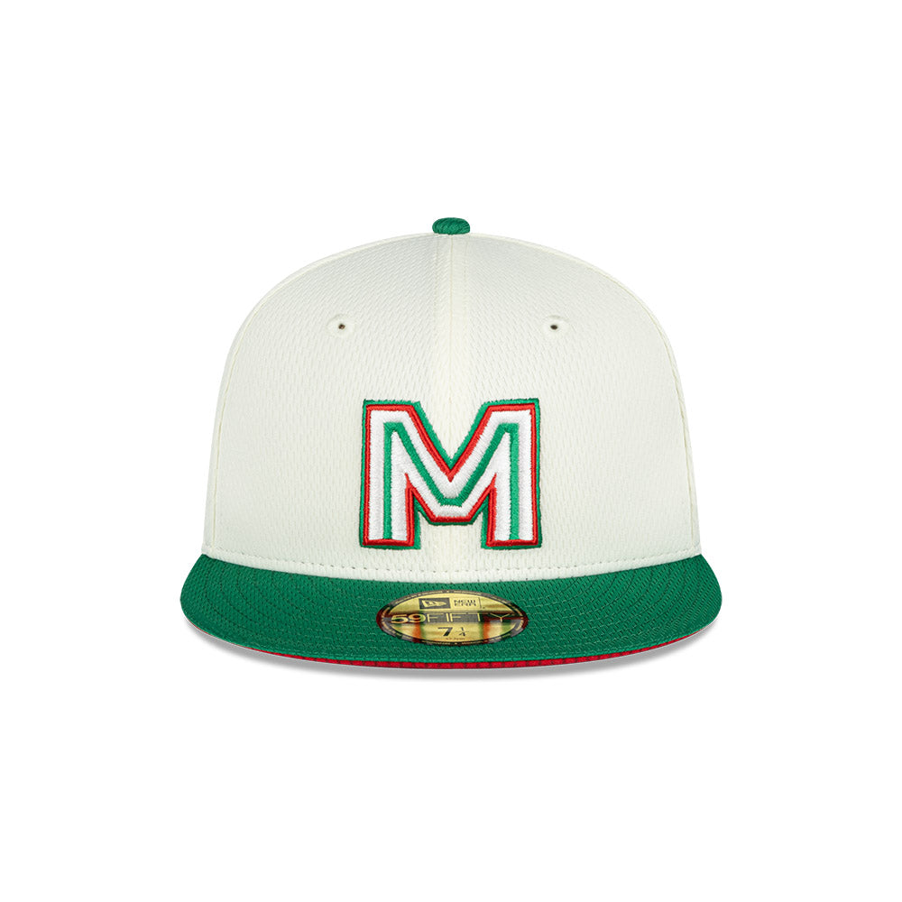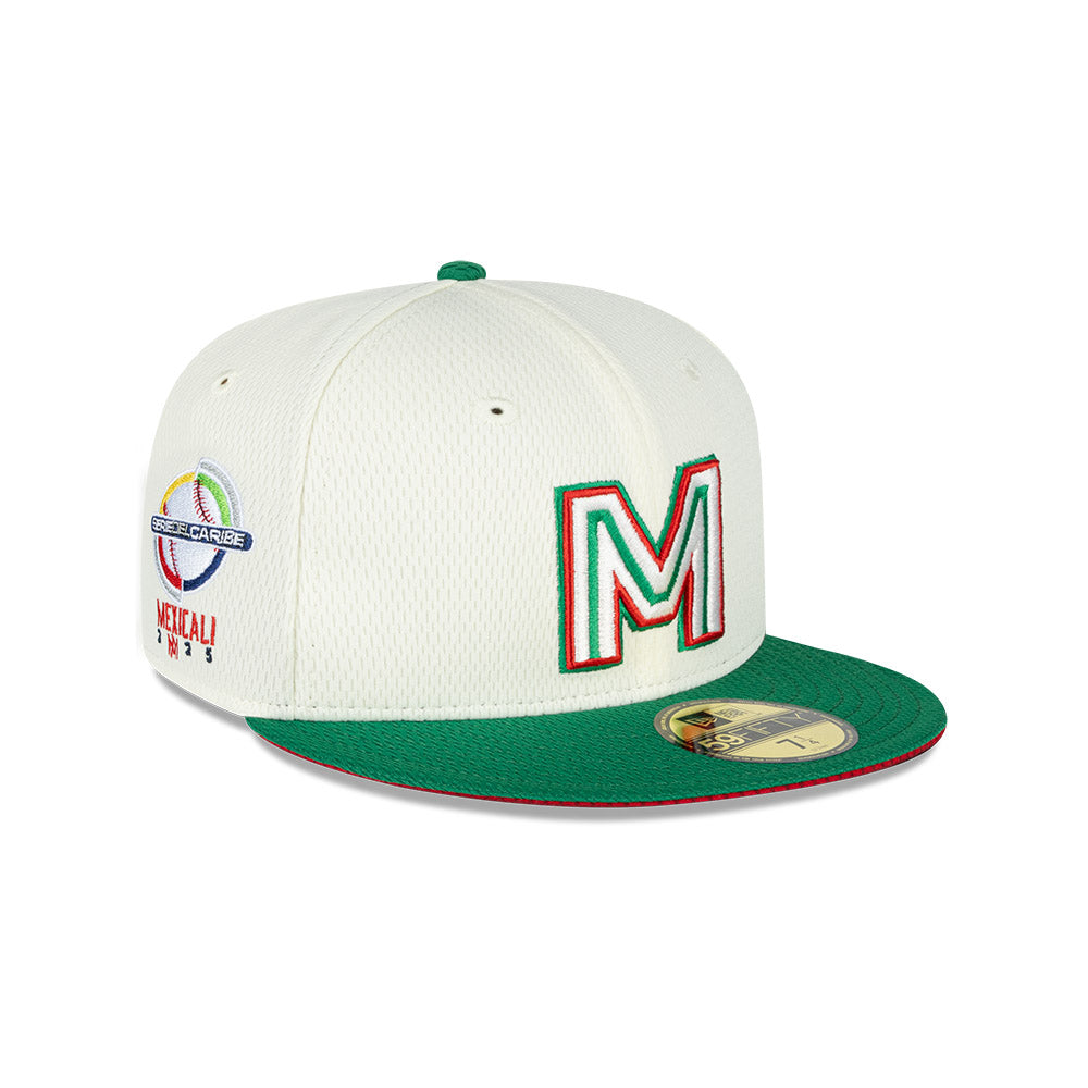 Esta gorra plana New Era 59FIFTY de la colección Serie del Caribe 2025 presenta un diseño con la icónica M de México bordada en los paneles frontales, el parche del torneo del lado derecho, el logo de la LAMP al reverso y el flag de New Era bordado del lado izquierdo. Cómprala ya.