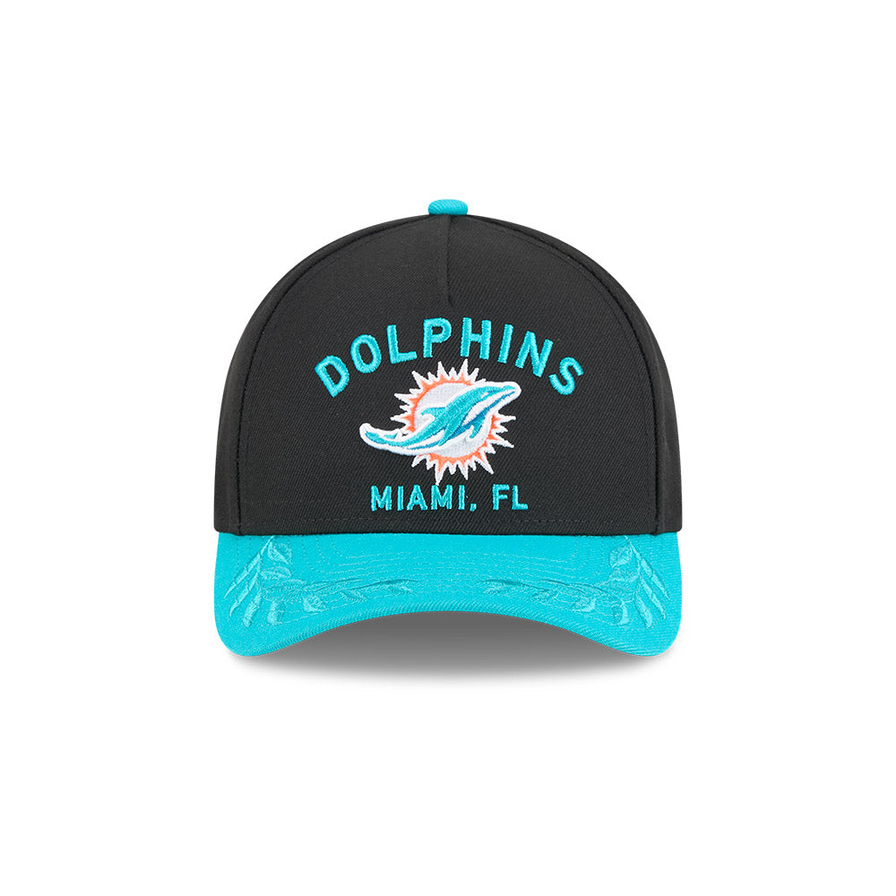 Esta gorra curva New Era 9FORTY M-Crown A-Frame de Miami Dolphins de la colección NFL Draft 2025 presenta el nombre y logotipo de los Dolphins bordados en los paneles frontales, laureles bordados en el visor, el logo de la NFL al reverso y el flag de New Era bordado del lado izquierdo. Cómprala ya.
