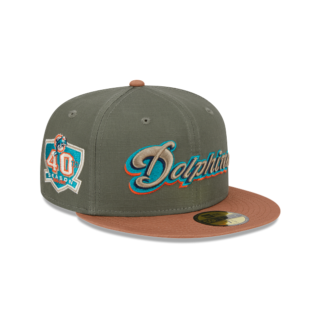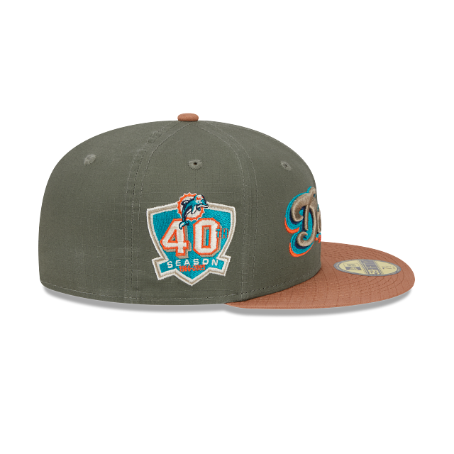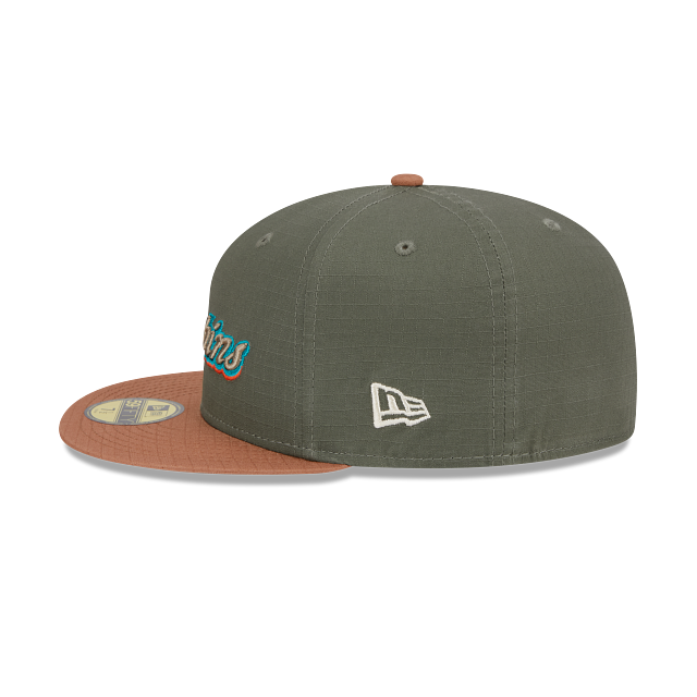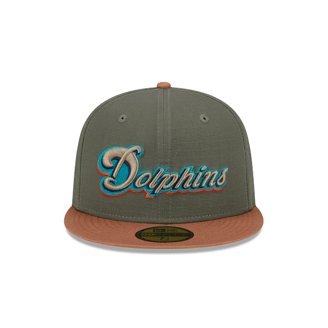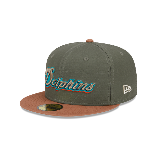 Esta gorra New Era 59FIFTY de Miami Dolphins de la colección NFL Ripstop presenta un diseño two tone con la corona en color verde olivo y la visera café, el nombre de los Dolphins bordado al frente, un parche conmemorativo del lado derecho, el logo de NFL dorado al reverso y el flag de New Era bordado en el lado izquierdo. Apoya a tu equipo y cómprala ya.