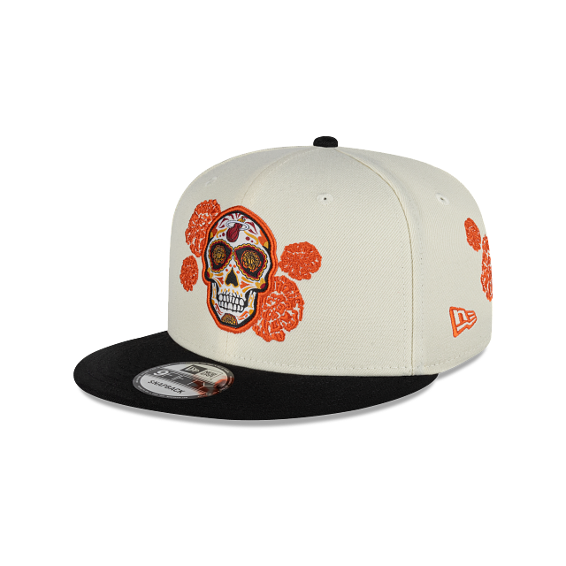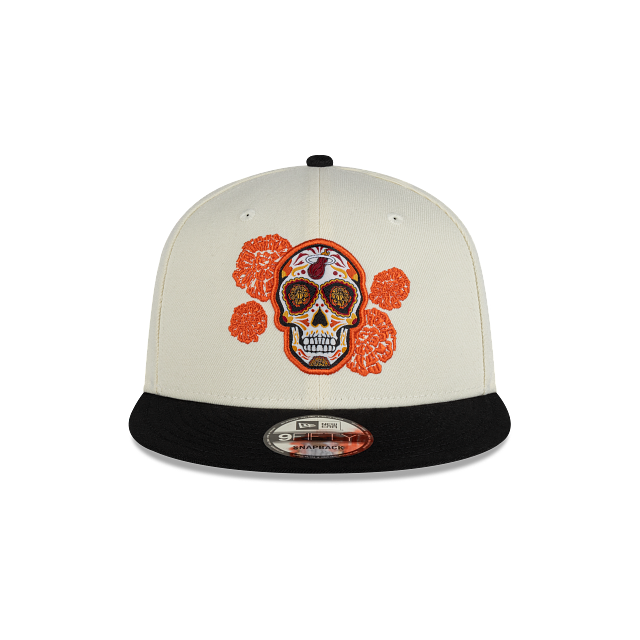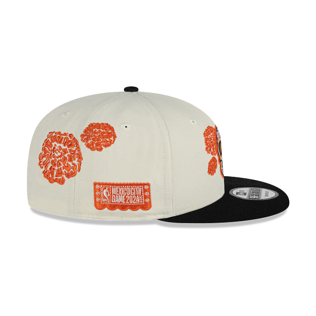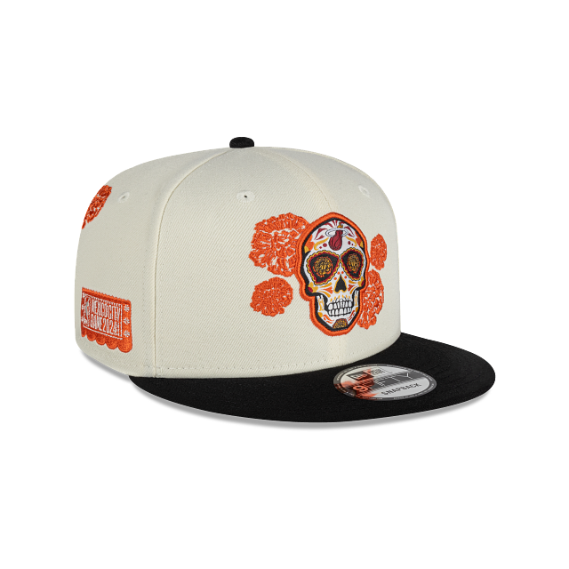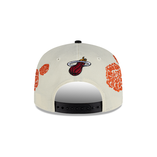 Esta gorra plana New Era 9FIFTY de Miami Heat de la colección NBA Mexico City Game 2024 presenta un diseño inspirado en el Día de Muertos con el logotipo de los Heat en una calaverita de azúcar bordada en los paneles frontales, flores de cempasúchil en la corona y el flag de New Era bordado del lado izquierdo. Cómprala ya.