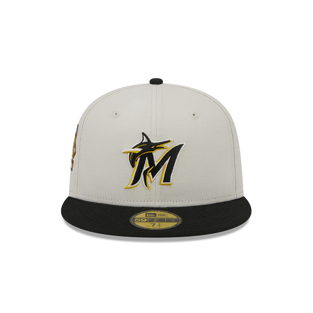 Esta gorra New Era 59FIFTY de Miami Marlins de la colección MLB Two Tone Stone presenta una visera negra y la corona blanca con el logotipo de los Marlins dorado bordado en los paneles frontales, un parche conmemorativo del lado derecho y el flag de New Era bordado en el lado izquierdo. Eleva tu estilo y cómprala ya.