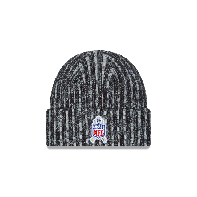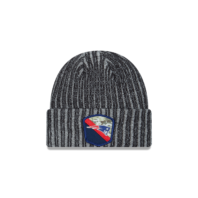 Este Knit New Era de New England Patriots de la colección NFL Salute to Service 2023 presenta un diseño con camuflaje predominantemente negro, el logotipo de los Patrios bordado al frente, el logo de NFL al reverso, la bandera de Estados Unidos y el flag de New Era a los costados. Apoya a tu equipo y cómpralo ya.