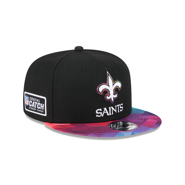 Esta gorra New Era 9FIFTY de New Orleans Saints de la colección NFL Crucial Catch 2023 en pro de la lucha contra el cáncer presenta un diseño en negro con el logotipo de los Saints y la visera con múltiples colores, un parche de Crucial Catch del lado derecho y el flag de New Era bordado en el lado izquierdo. Apoya a tu equipo y cómprala ya.