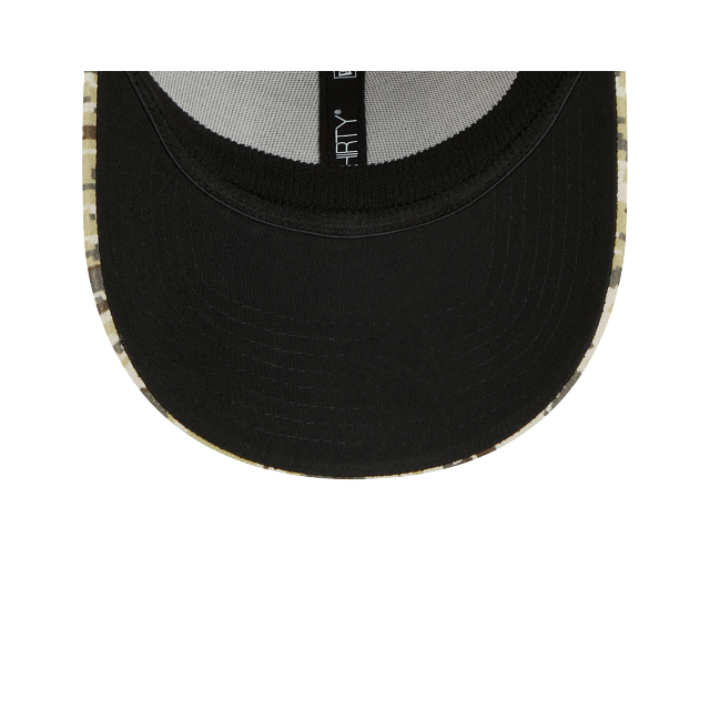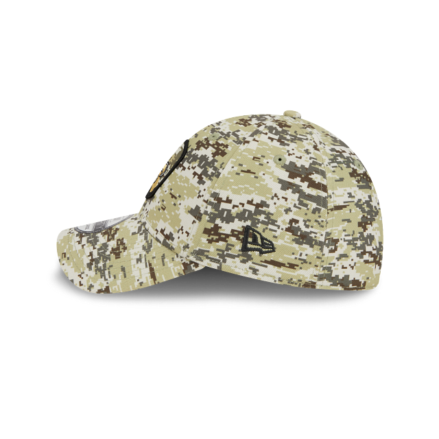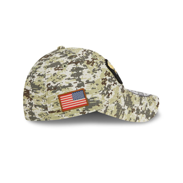 Esta gorra New Era 39THIRTY de New Orleans Saints de la colección NFL Salute to Service 2023 presenta un diseño en camuflaje con el logotipo de los Saints bordado en los paneles frontales, la bandera de Estados Unidos del lado derecho, el undervisor del color del equipo, el logo de la NFL al reverso y el flag de New Era bordado en el lado izquierdo. Cómprala ya.