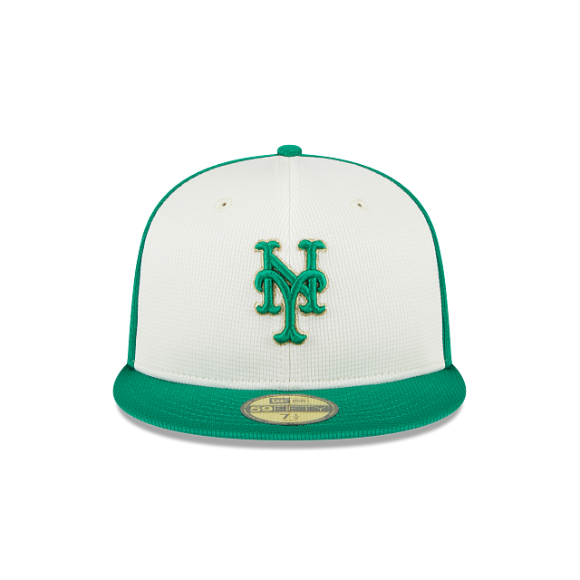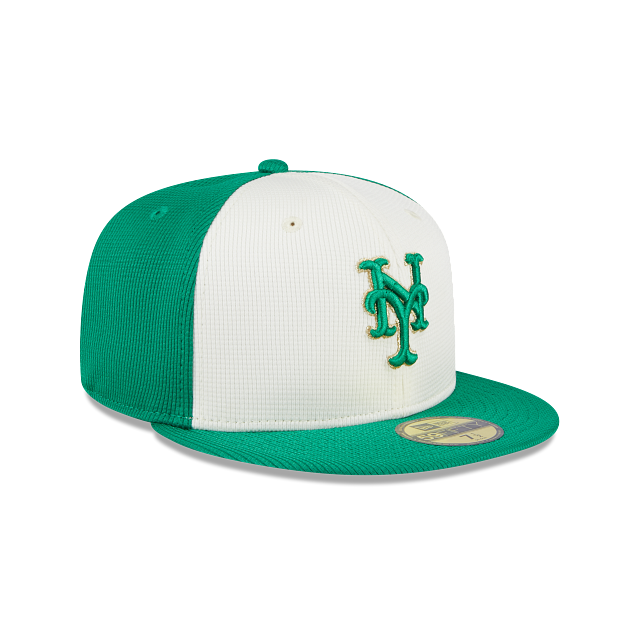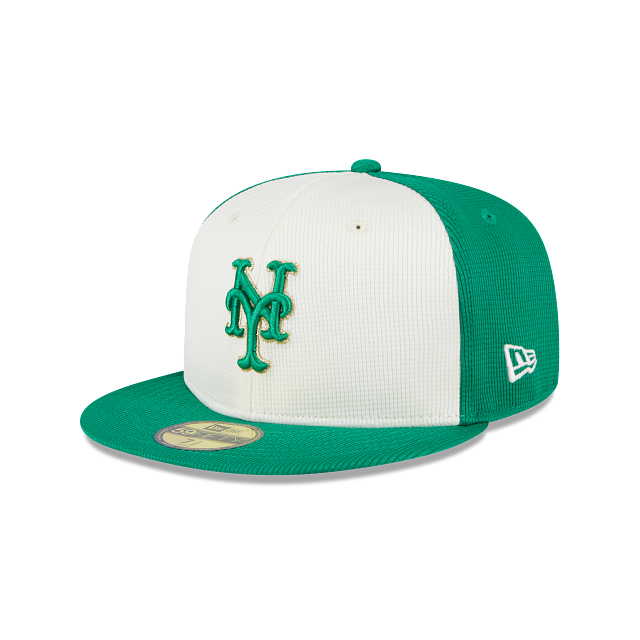 Esta gorra New Era 59FIFTY de New York Mets de la colección MLB St. Patrick's Day 2024 presenta el logotipo de los Mets con contorno dorado bordado en los paneles frontales en color blanco que contrasta con el clásico verde de la celebración, el MLB Batterman al reverso y el flag de New Era bordado en el lado izquierdo. Cómprala ya.