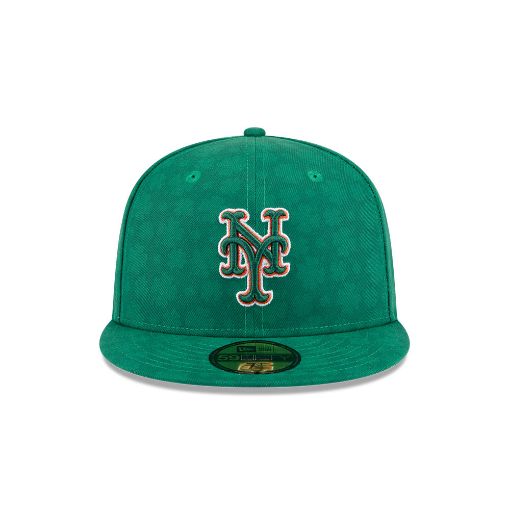 Esta gorra plana New Era 59FIFTY de New York Mets de la colección MLB St. Patrick's Day 2025 presenta un diseño con el clásico verde de la celebración acompañado de un patrón de tréboles de cuatro hojas en toda la corona y visor, el logotipo de los Mets bordado en los paneles frontales, el MLB Batterman al reverso y el flag de New Era bordado del lado izquierdo. Cómprala ya.