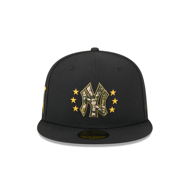 Rinde homenaje a las fuerzas armadas con esta gorra New Era 59FIFTY de New York Yankees de la colección MLB Armed Forces Day 2024 que presenta un diseño negro con el logotipo de los Yankees camuflajeado bordado en los paneles frontales rodeado de estrellas, un parche conmemorativo del lado derecho, undervisor verde, el MLB Batterman al reverso y el flag de New Era bordado en el lado izquierdo. Cómprala ya.