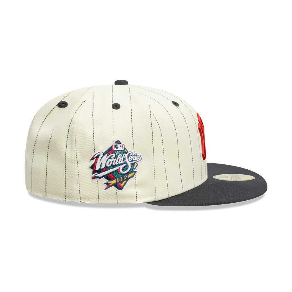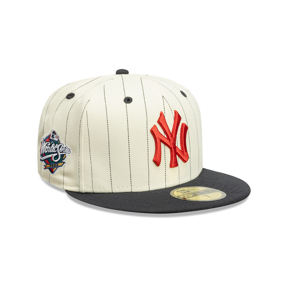 Esta gorra plana New Era 59FIFTY de New York Yankees de la colección MLB Stripe presenta un diseño a rayas con el logotipo de los Yankees bordado en los paneles frontales, un parche World Series del lado derecho, el MLB Batterman al reverso y el flag de New Era bordado del lado izquierdo. Cómprala ya.