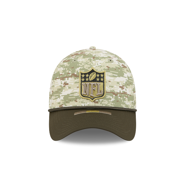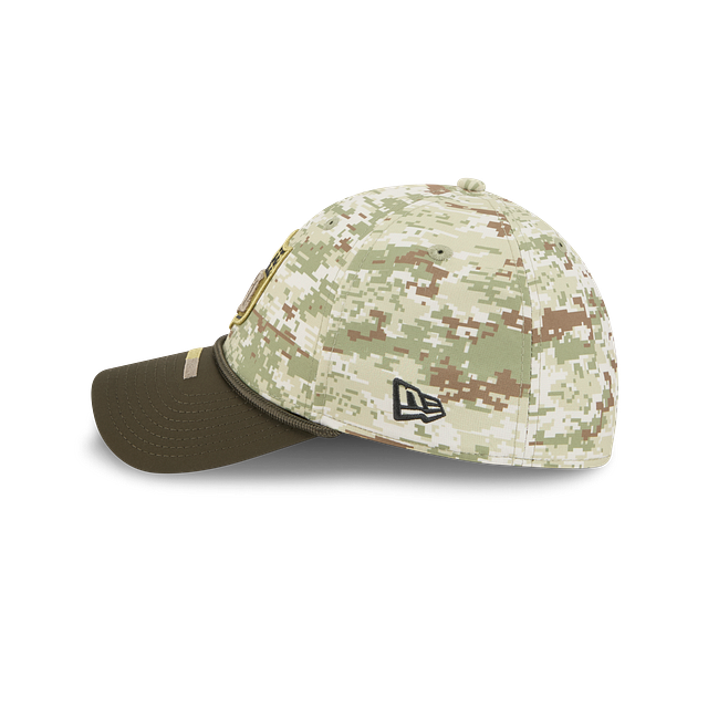 Esta gorra curva New Era 39THIRTY de de la colección NFL Salute to Service 2025 presenta un diseño de camuflaje con el logotipo de la NFL bordado en los paneles frontales, la bandera de Estados Unidos del lado derecho, el logo de la NFL en la parte de atrás, el logo de la NFL en el undervisor y el flag de New Era bordado del lado izquierdo. Cómprala ya.