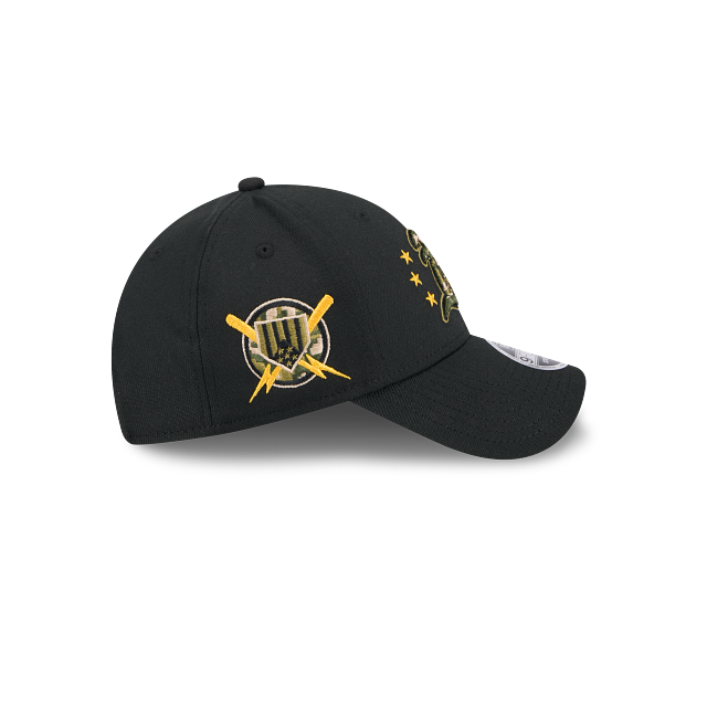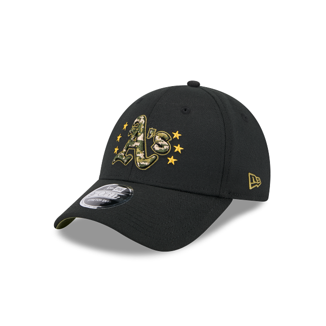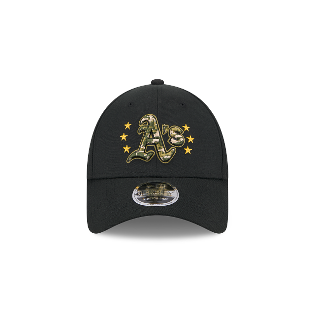 Rinde homenaje a las fuerzas armadas con esta gorra New Era 9FORTY de Oakland Athletics de la colección MLB Armed Forces Day 2024 que presenta un diseño negro con el logotipo de los Athletics camuflajeado bordado en los paneles frontales rodeado de estrellas, un parche conmemorativo del lado derecho, undervisor verde y el flag de New Era bordado en el lado izquierdo. Cómprala ya.
