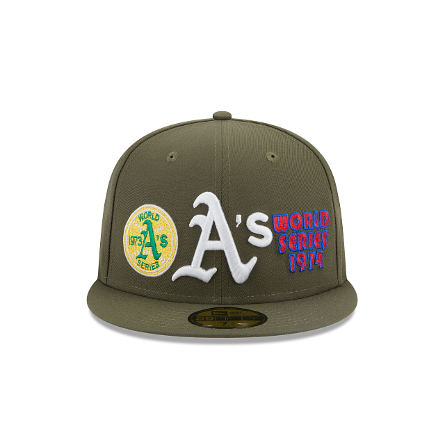Esta gorra New Era 59FIFTY de Oakland Athletics de la colección MLB Olive presenta un diseño con múltiples parches conmemorativos en la corona estilo all over, el logotipo de los Athletics bordado en los paneles frontales, el Batterman al reverso y el flag de New Era bordado en el lado izquierdo. Cómprala ya.