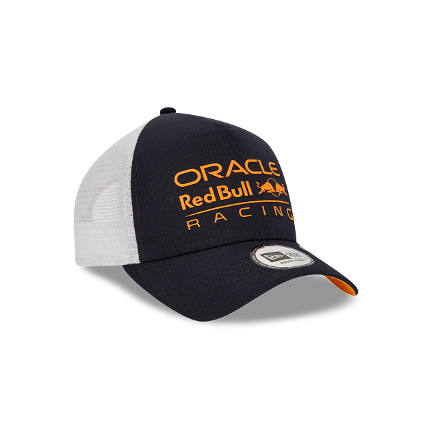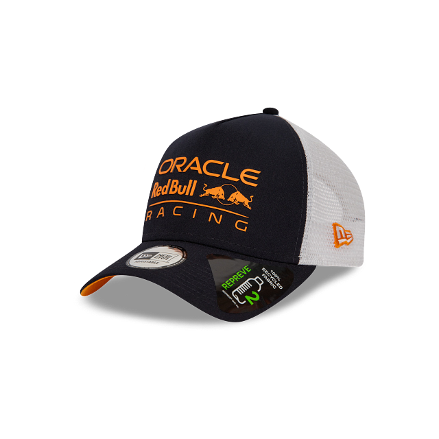 Esta gorra New Era Repreve 9FORTY AF Trucker de Oracle Red Bull Racing de la colección Seasonal Collection presenta un diseño azul con vistas en color naranja, el logotipo de Red Bull Racing estampado en los paneles frontales, malla blanca al reverso y el flag de New Era bordado en el lado izquierdo. Apoya a tu escudería favorita y cómprala ya.