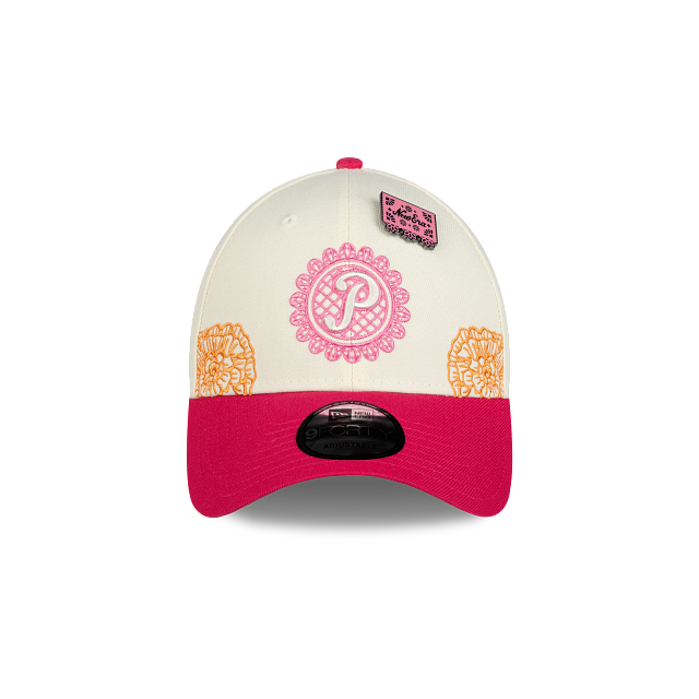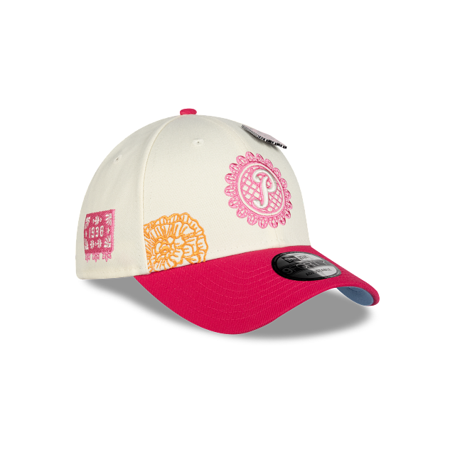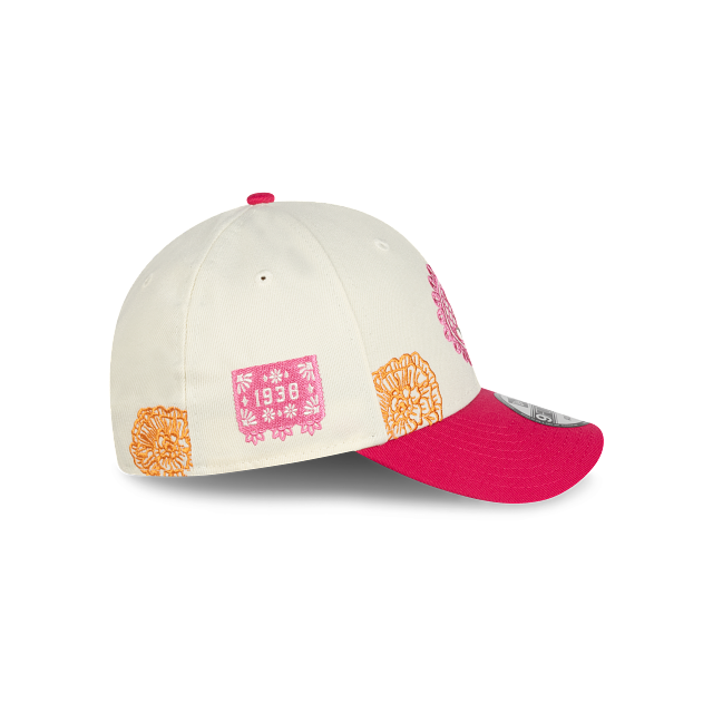 Esta gorra curva New Era 9FORTY de Pericos de Puebla de la colección LMB Día de Muertos presenta un diseño inspirado en la artesanía del papel picado con el logotipo de los Pericos bordado en los paneles frontales, detalles de flores de cempasúchil en la corona, un pin en forma de papel picado y el flag de New Era bordado del lado izquierdo. Cómprala ya.