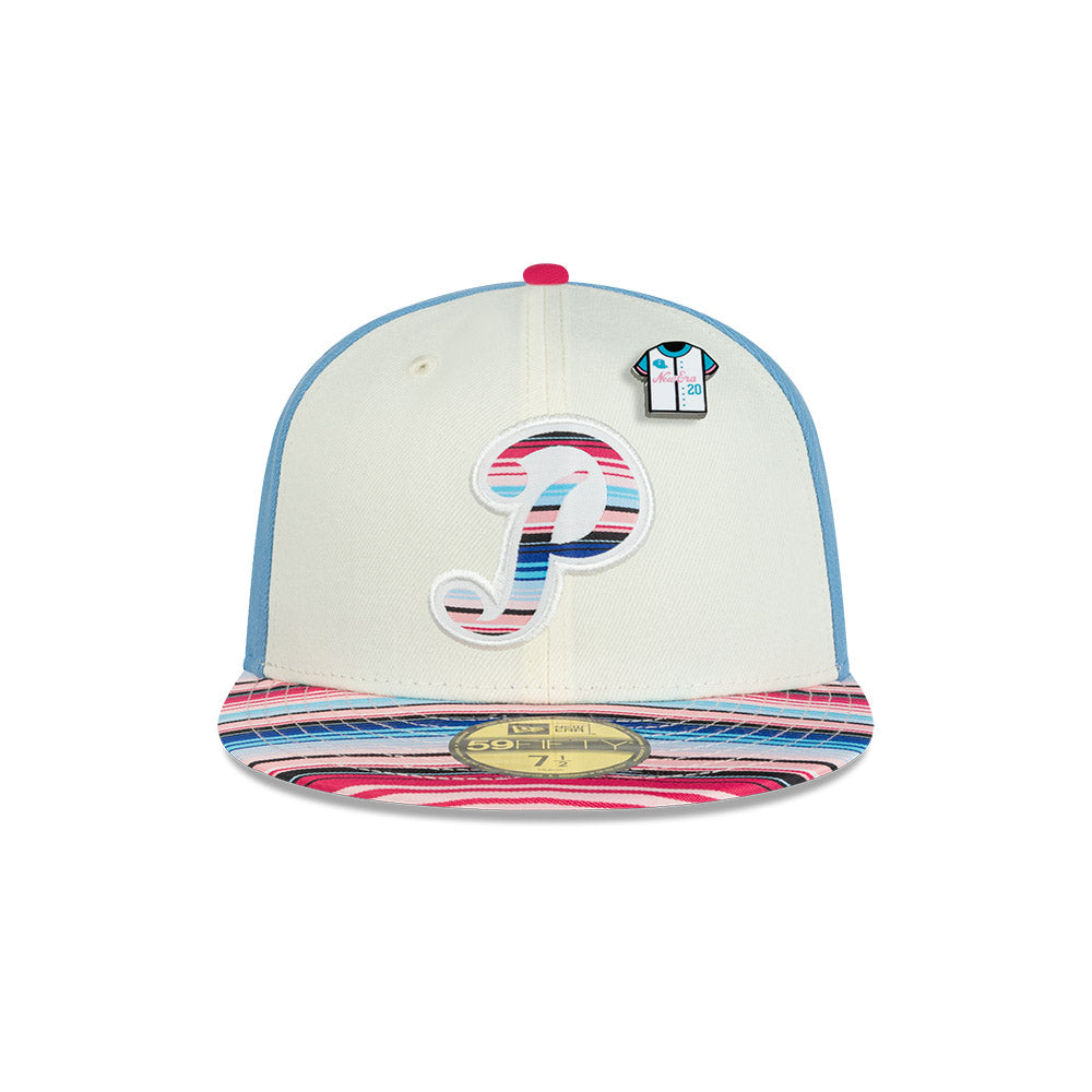 Esta gorra plana New Era 59FIFTY de Pericos de Puebla de la colección LMB Sarape presenta el logotipo de los Pericos bordado en los paneles frontales, el visor con un diseño inspirado en los colores y patrones tradicionales del sarape, el nombre del equipo al reverso, un pin en forma de Jersey y el flag de New Era bordado del lado izquierdo. Cómprala ya.