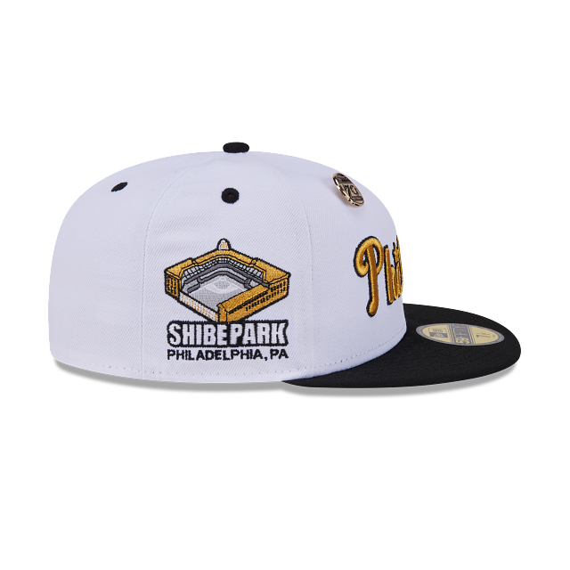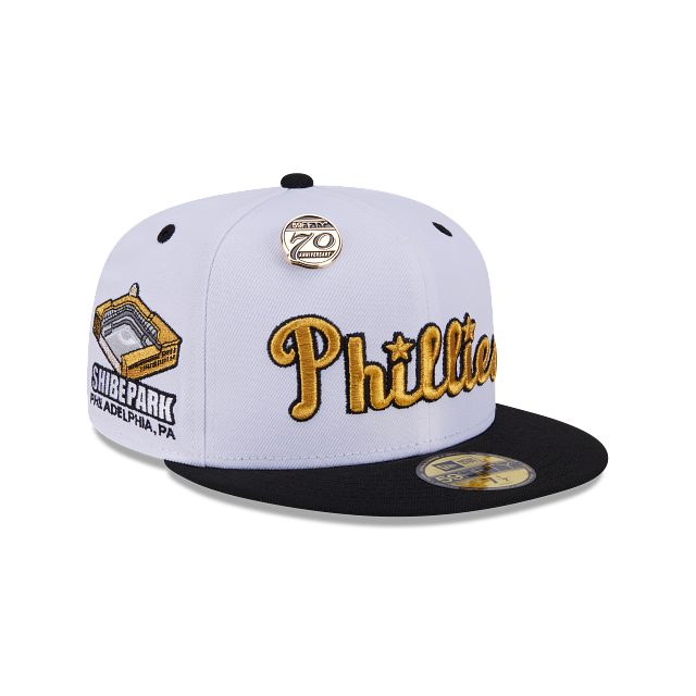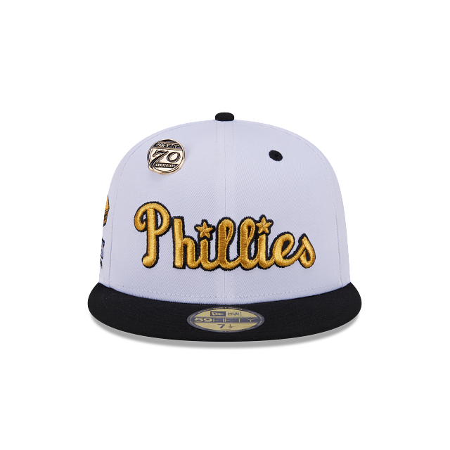Celebra el 70 aniversario de la silueta que cambió el juego con esta gorra New Era 59FIFTY de Philadelphia Phillies de la colección del New Era Cap 59FIFTY Day Collection que presenta una corona blanca con el nombre de los Phillies en dorado bordado en los paneles frontales, el pin del 70 aniversario, un parche conmemorativo del lado derecho, el logo de la liga al reverso y el flag de New Era bordado en el lado izquierdo. No te pierdas este artículo de colección y cómprala ya.