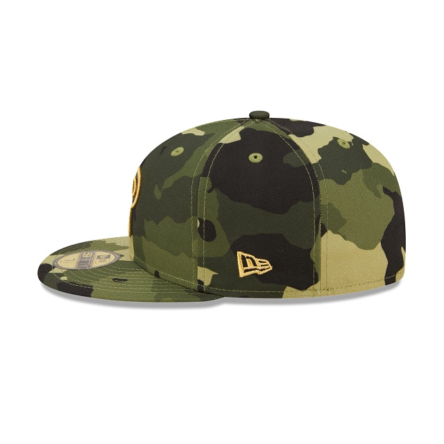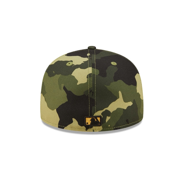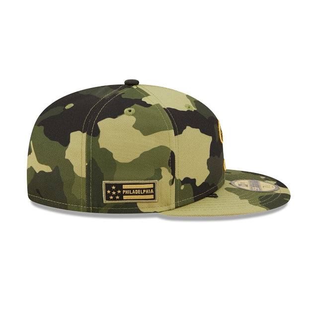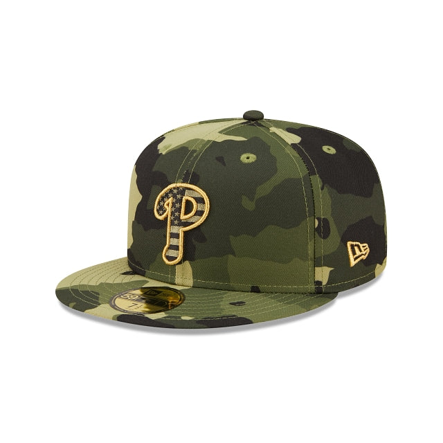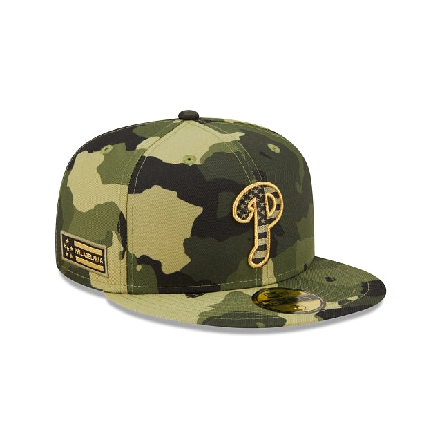 Esta gorra 59FIFTY de Philadelphia Phillies de la colección MLB Armed Forces Day 2022 presenta el logotipo de los Phillies en los paneles frontales con el contorno dorado y en el centro la bandera de los Estados Unidos, sobre un diseño en camuflaje verde. Detalles adicionales incluyen parche militar del equipo en el lado derecho. Cómprala ya.