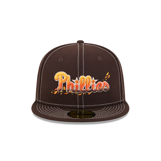 Esta gorra plana New Era 59FIFTY de Philadelphia Phillies de la colección MLB Fall Foliage presenta un diseño inspirado en la estación de otoño con el nombre de los Phillies bordado en los paneles frontales, un parche conmemorativo del lado derecho, el MLB Batterman al reverso y el flag de New Era bordado del lado izquierdo. Cómprala ya.