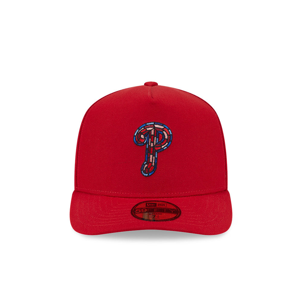 Esta gorra pre curveada New Era 59FIFTY A-Frame de Philadelphia Phillies de la colección MLB Stained Glass presenta el logotipo de los Phillies con efecto de vitral bordado en los paneles frontales, el MLB Batterman y logo del equipo al reverso, y el flag de New Era bordado del lado izquierdo. Cómprala ya.