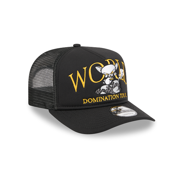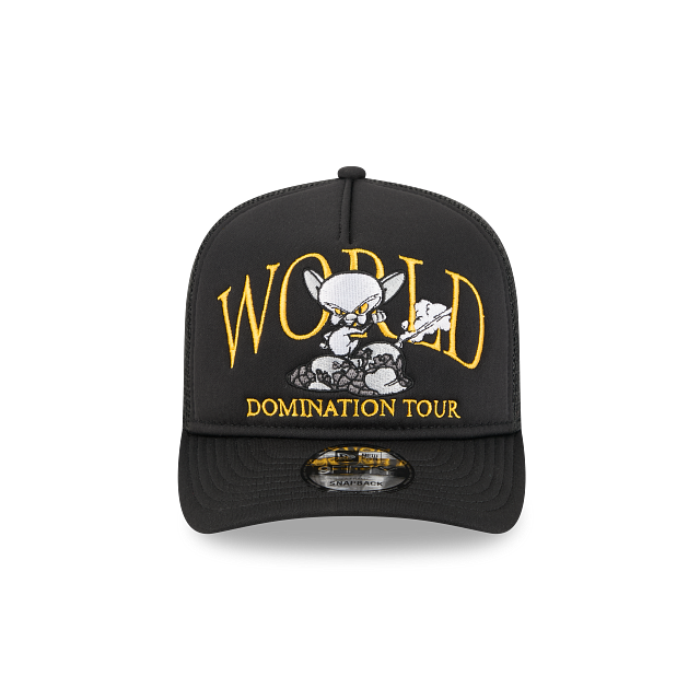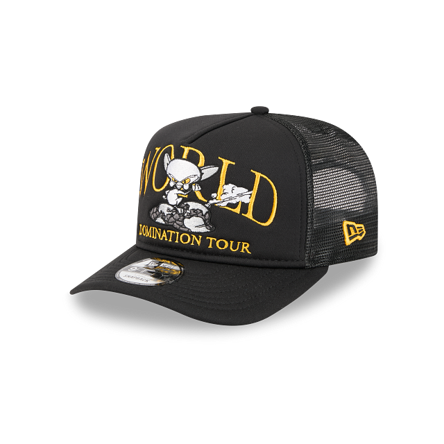 Esta gorra curva New Era 9FIFTY A-Frame Trucker de Pinky y Cerebro presenta un diseño en color negro con el personaje Cerebro con la frase World Domination Tour bordados en el panel frontal, malla trucker en la parte de atrás y el flag de New Era bordado del lado izquierdo. Cómprala ya.