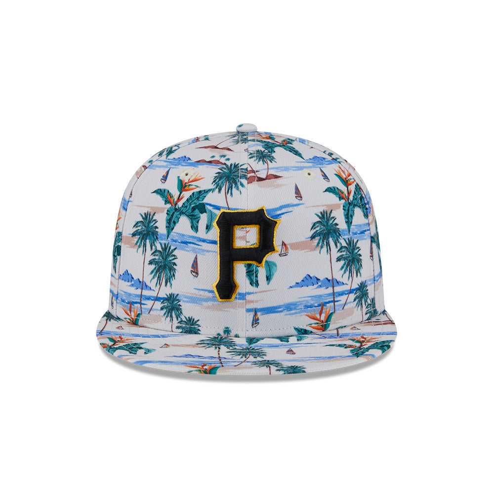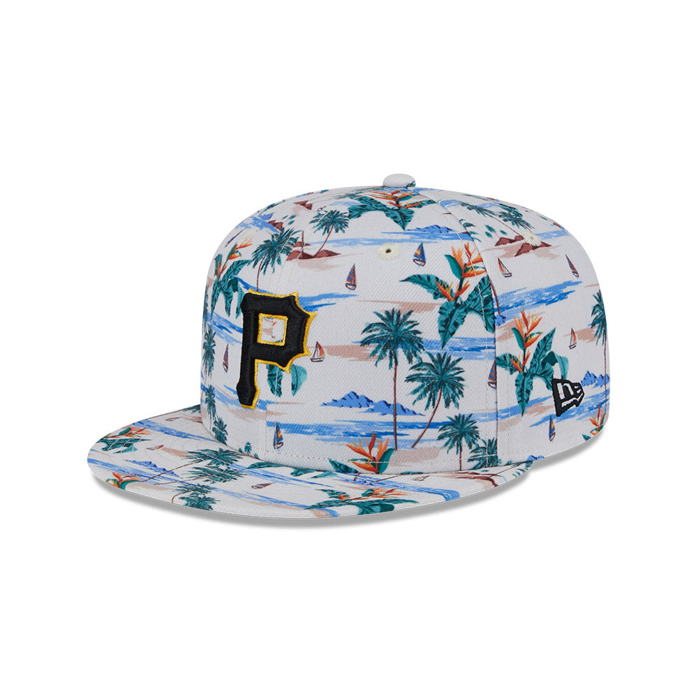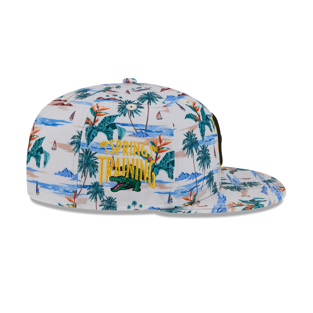Esta gorra plana New Era 9FIFTY de Pittsburgh Pirates de la colección MLB Spring Training Fan Pack 2025 presenta un all over print de un paisaje tropical con el logotipo de los Pirates bordado en los paneles frontales, Spring Training bordado del lado derecho y el flag de New Era bordado del lado izquierdo. Cómprala ya.