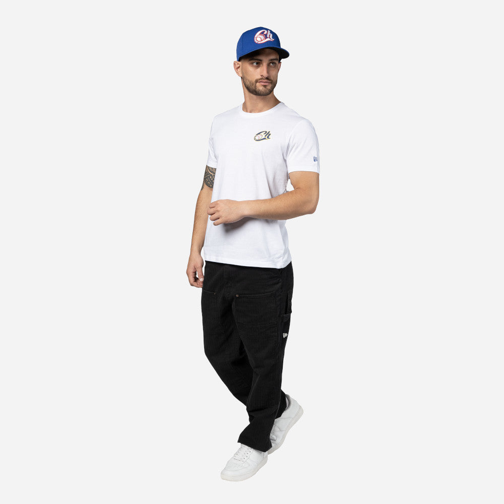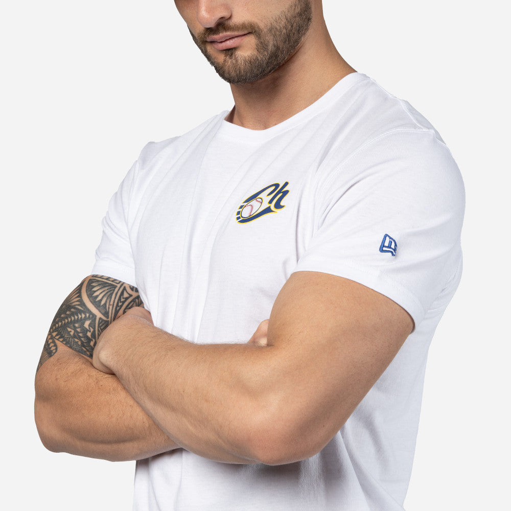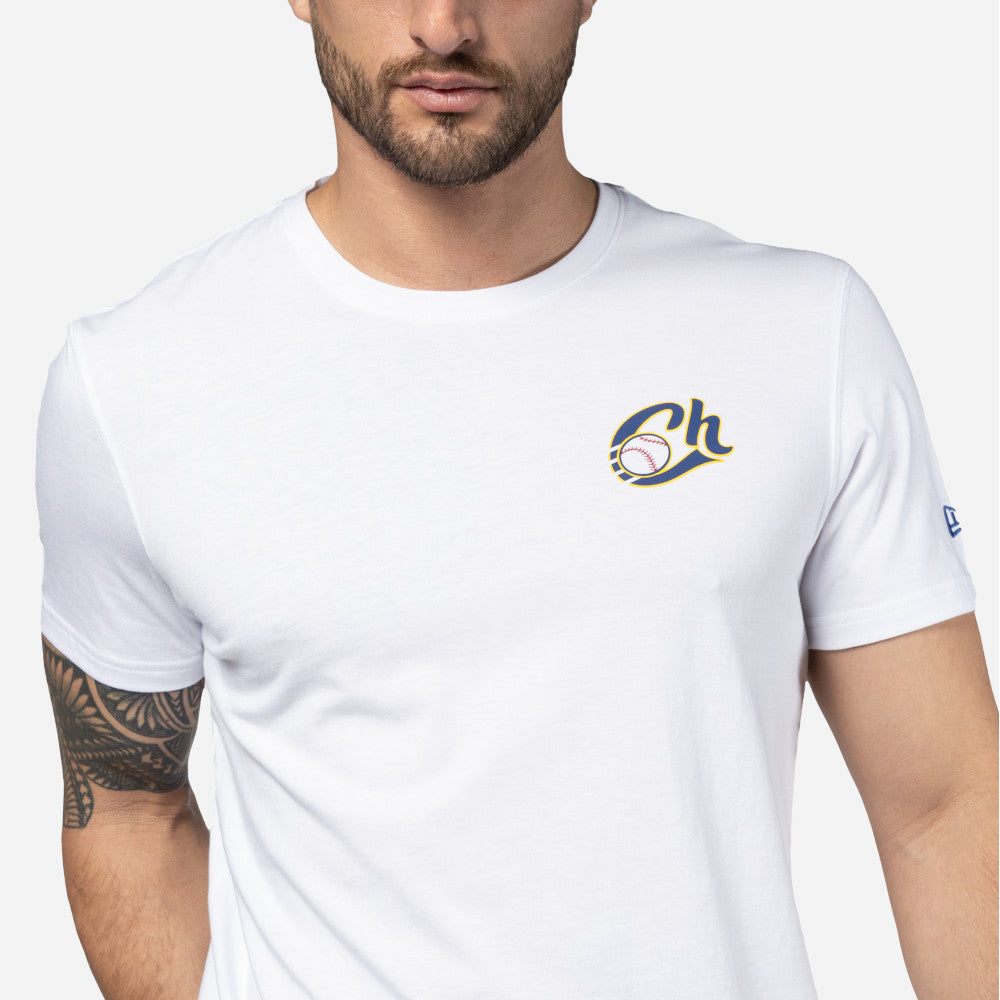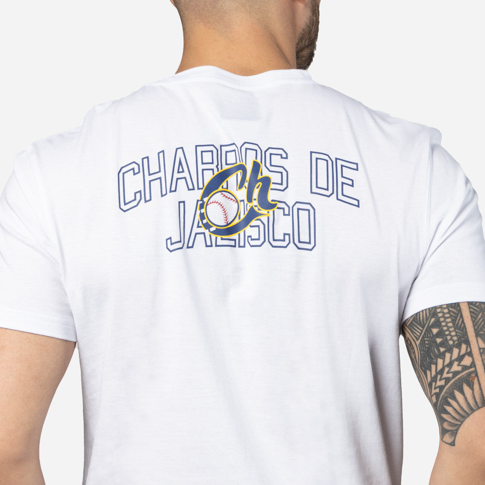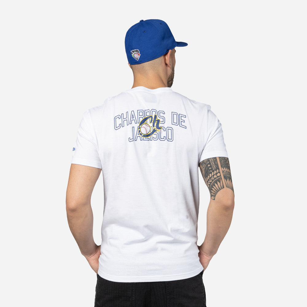 Esta Playera Manga Corta New Era de Charros de Jalisco de la colección LMB Invenue presenta un diseño blanco que será una pieza fundamental de tu outfit en el estadio con el logotipo de los Charros estampado al frente, el nombre en grande al reverso y el flag de New Era bordado en la manga izquierda. ¡Dale un toque a tu outfit y cómprala ya!