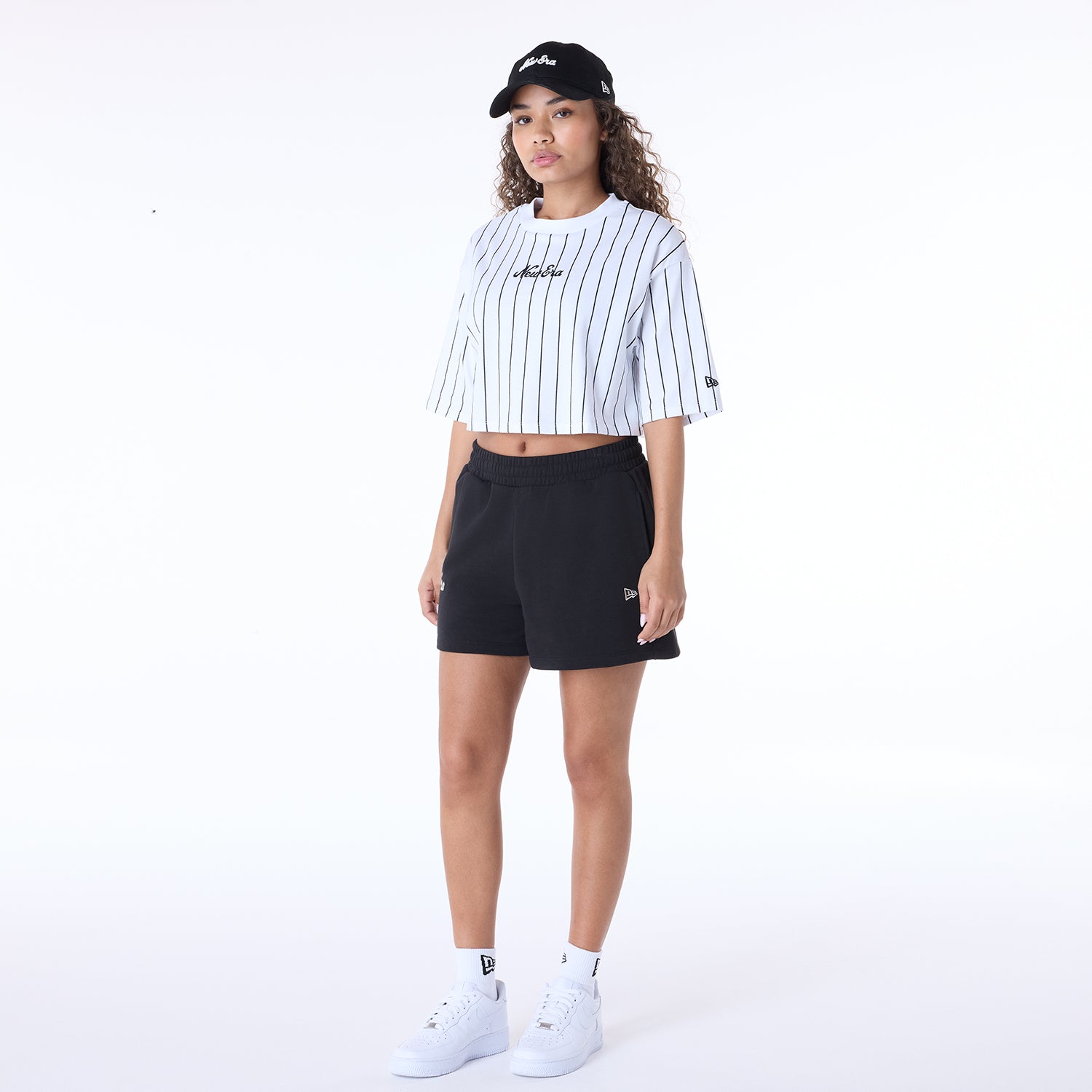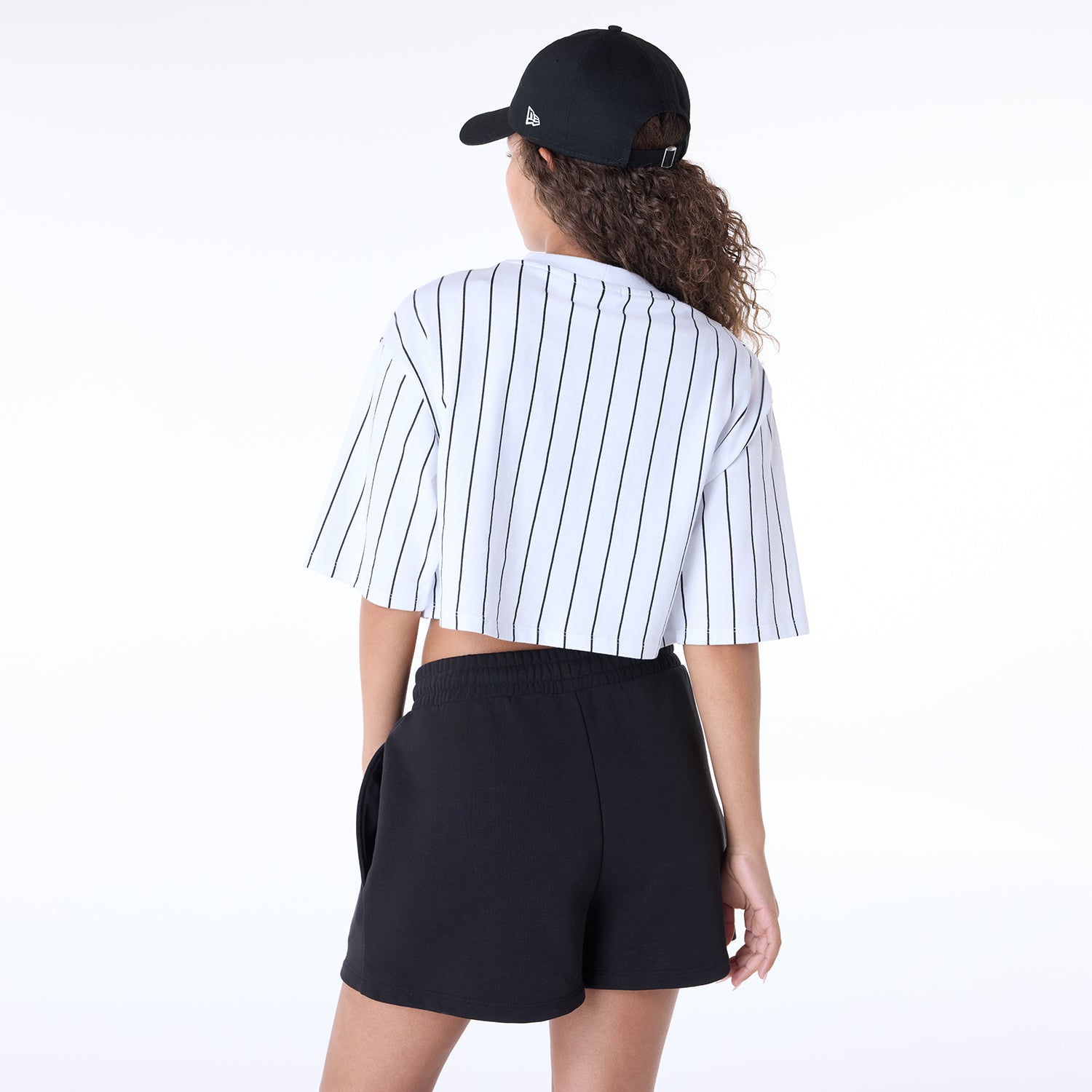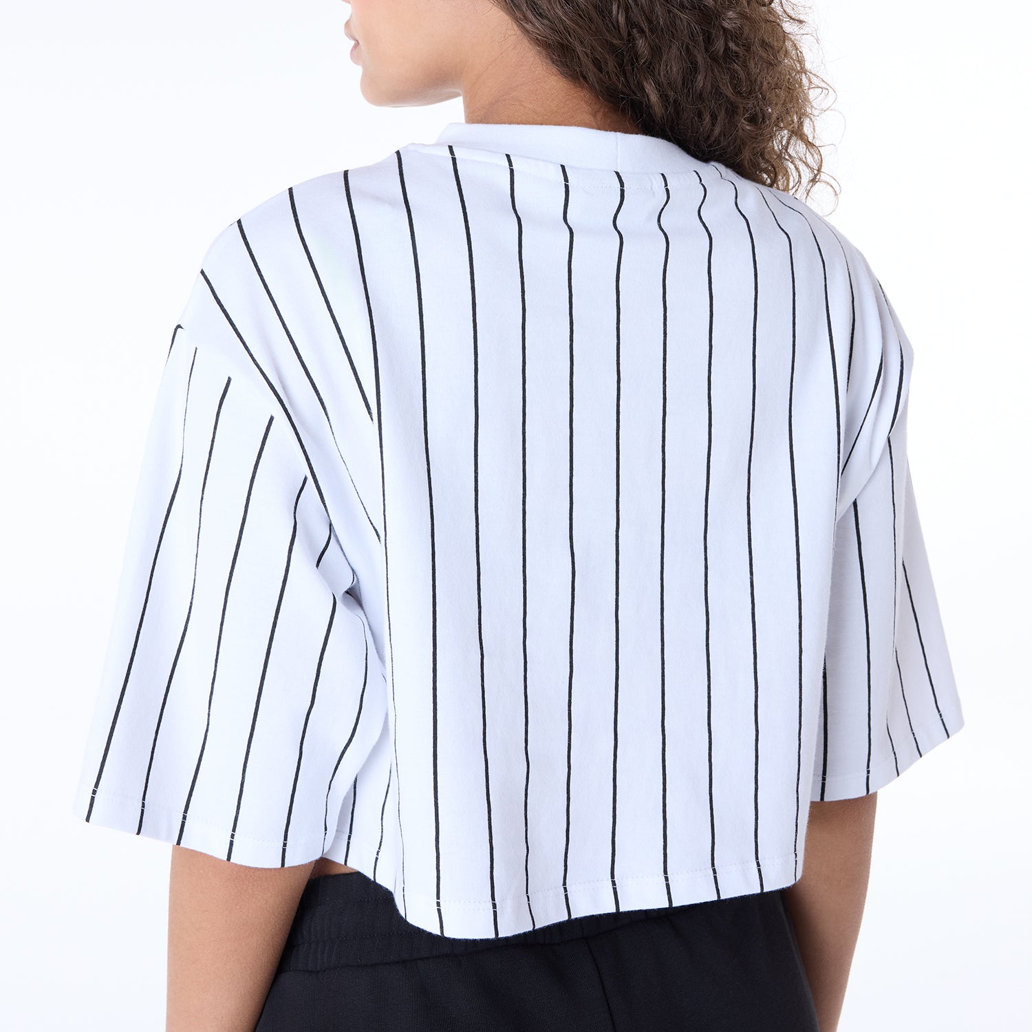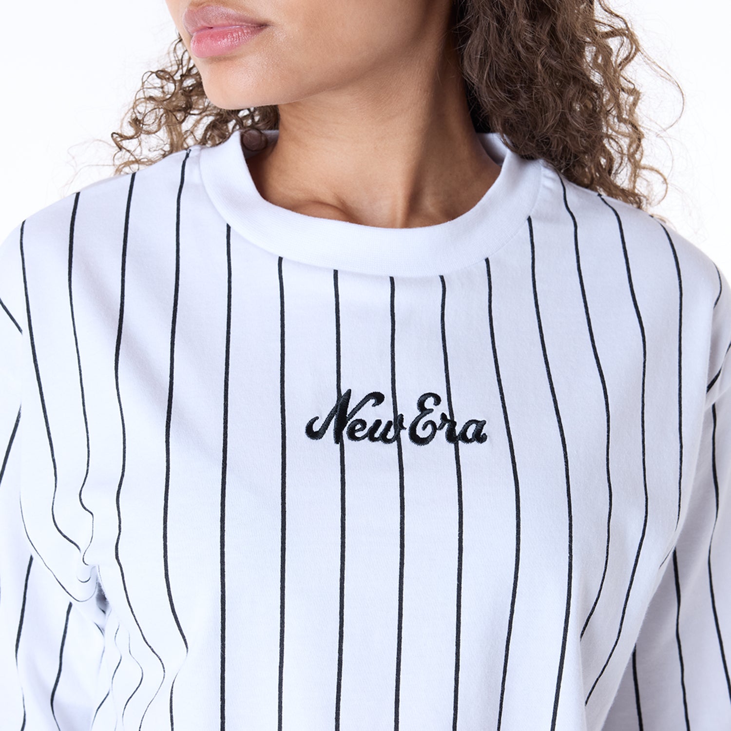 Esta Playera Manga Corta Cropped New Era para Mujer de la colección New Era Script presenta un diseño pinstripe con el script de New Era bordado en la parte frontal y el flag de New Era bordado en la manga izquierda. Cómprala ya.