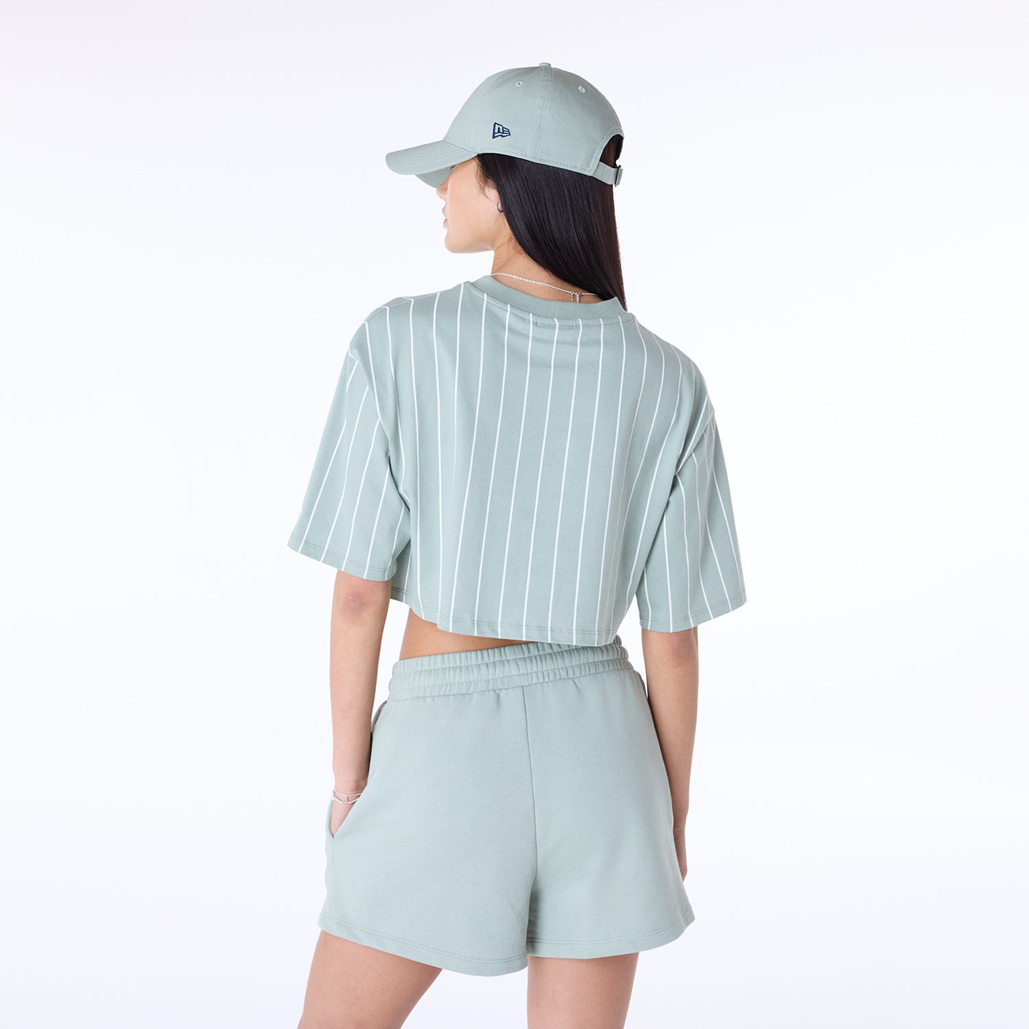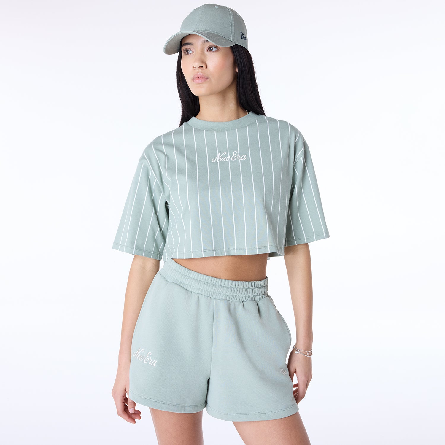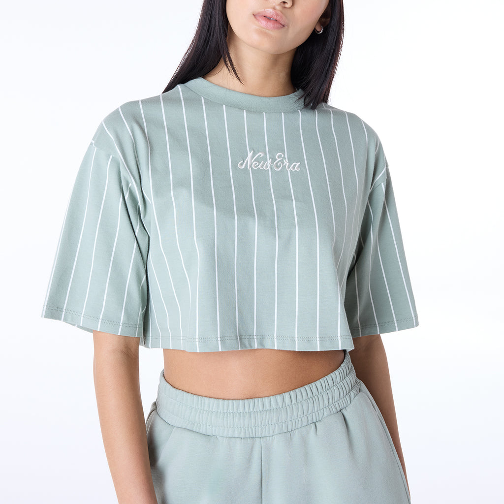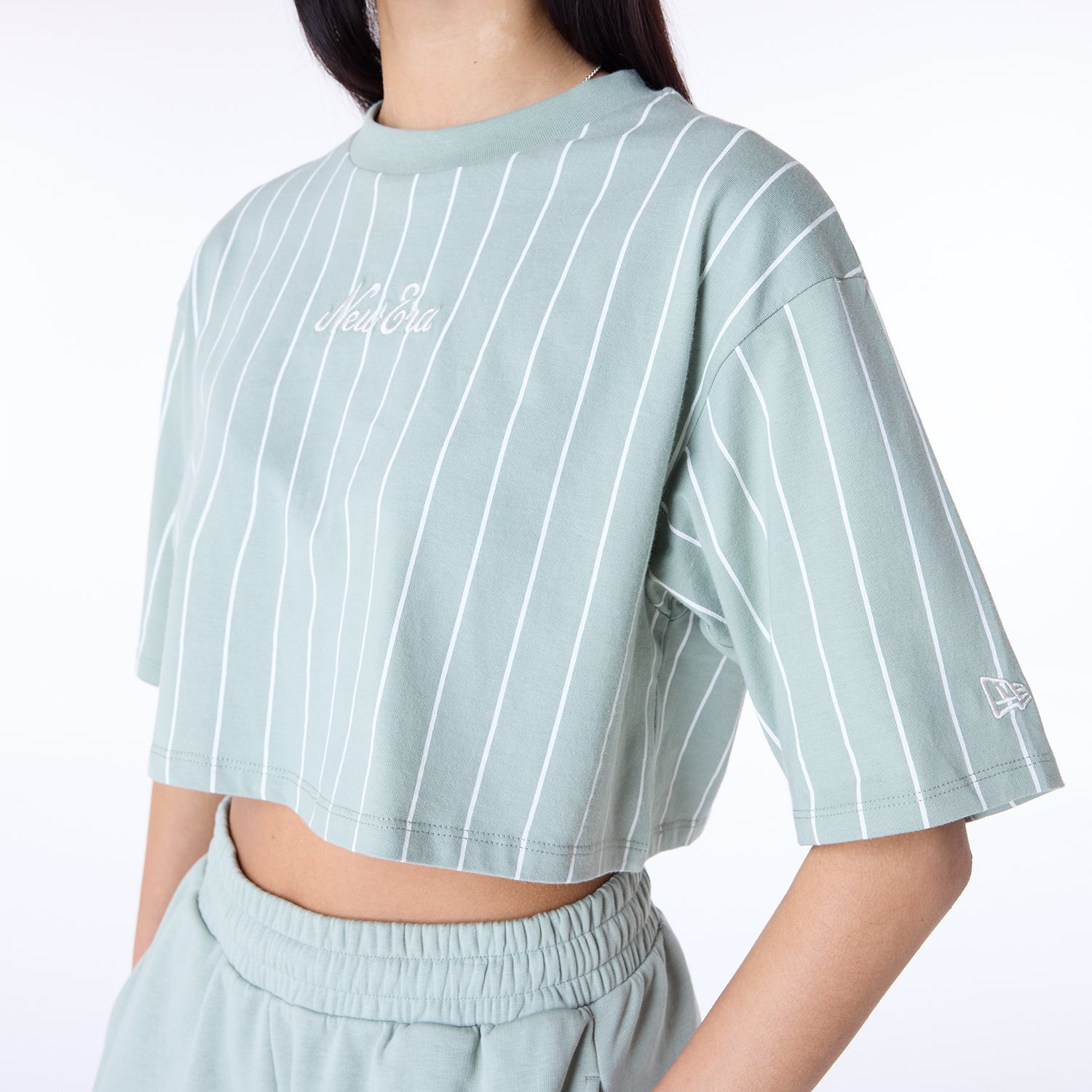 Esta Playera Manga Corta Cropped New Era para Mujer de la colección New Era Script presenta un diseño pinstripe con el script de New Era bordado en la parte frontal y el flag de New Era bordado en la manga izquierda. Cómprala ya.