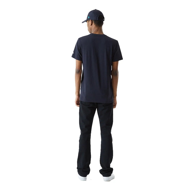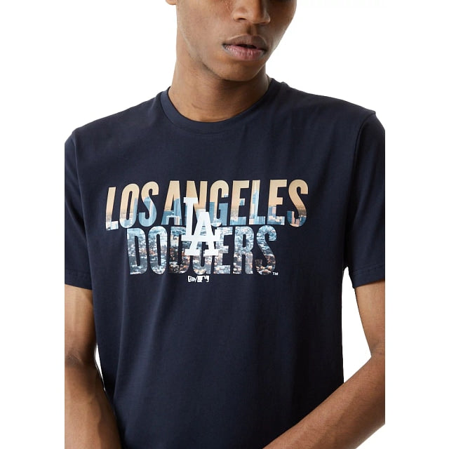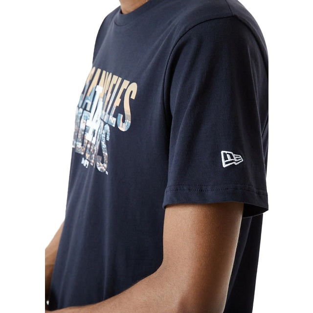 Playera New Era 100% de algodón con logotipo del equipo y estampado de la palabra con fondo fotográfico en el centro del frente, etiqueta de la liga tejida en el dobladillo derecho y bordado directo de la bandera de New Era en la manga izquierda.
