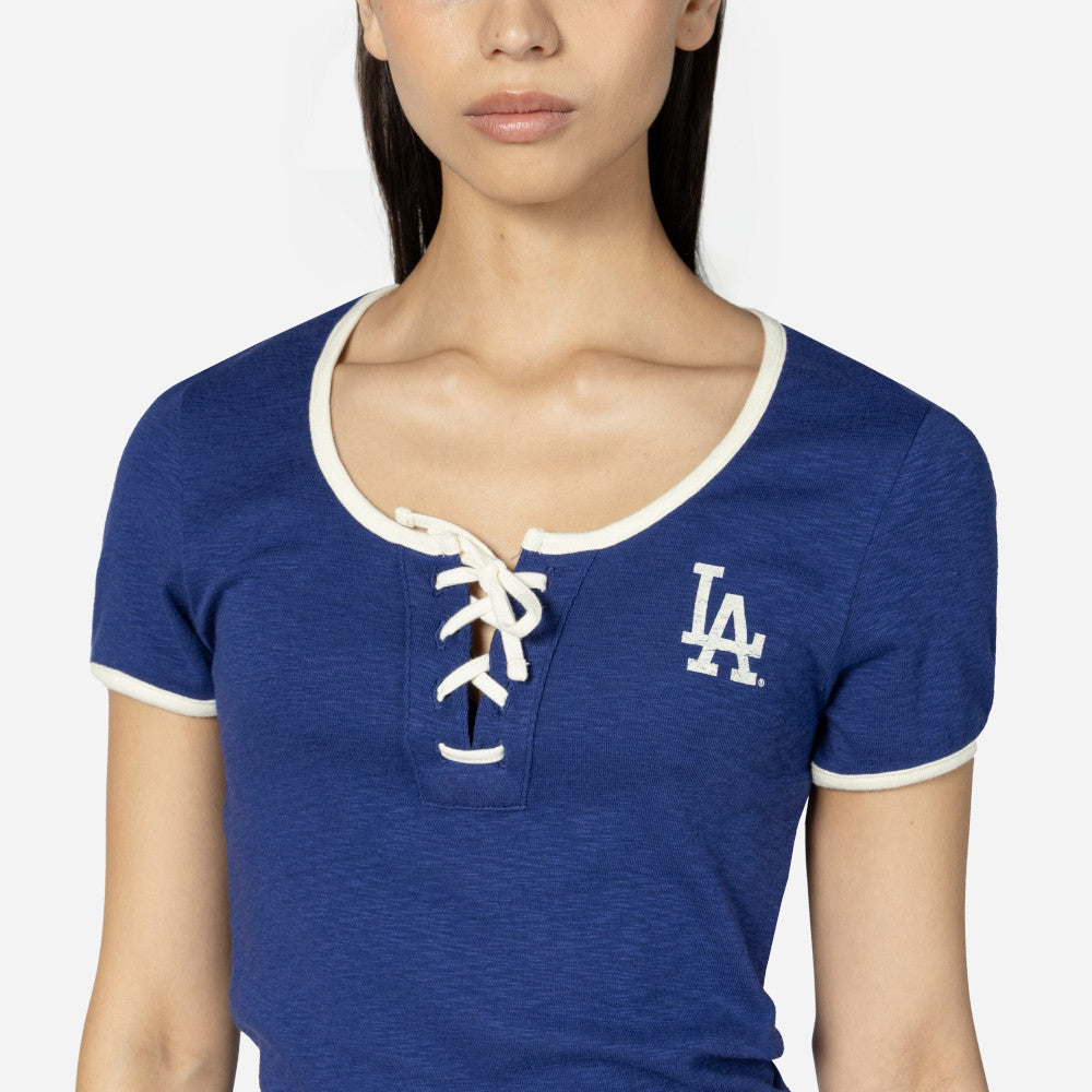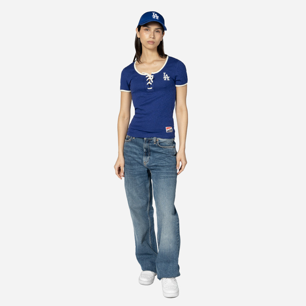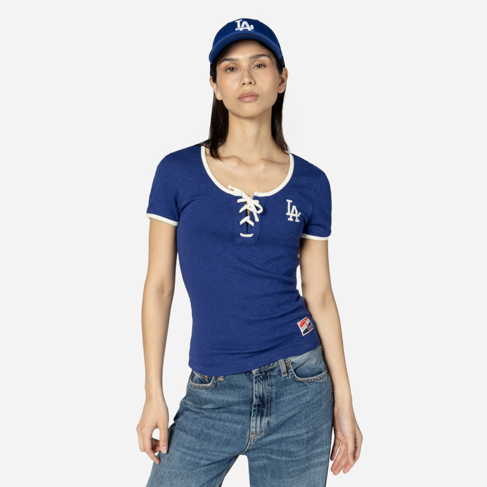 Esta Playera Manga Corta New Era para Mujer de Los Angeles Dodgers de la colección MLB Throwback presenta un diseño con el cuello con un cordón ajustable, el logotipo de los Dodgers en la parte frontal izqzuierda. Completa tu outfit y cómprala ya.