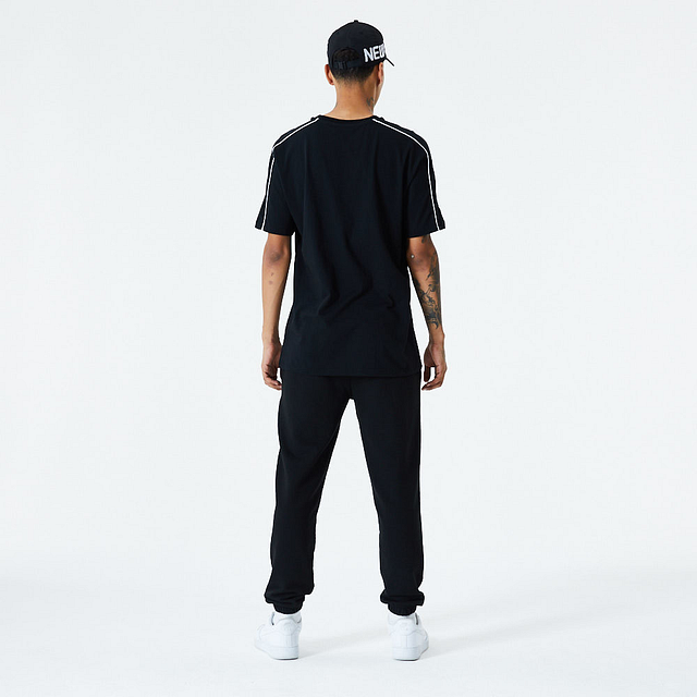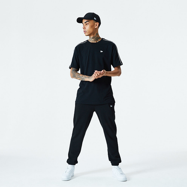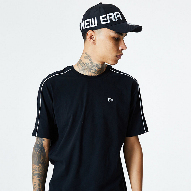 Esta Playera Manga Corta New Era de la colección New Era Essentials presenta un diseño negro con líneas blancas en los hombros, el logotipo de la marca bordado discretamente en el frente y el flag de New Era bordado en la manga izquierda. Luce con estilo y cómprala ya.
