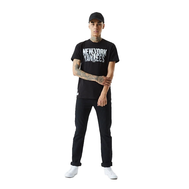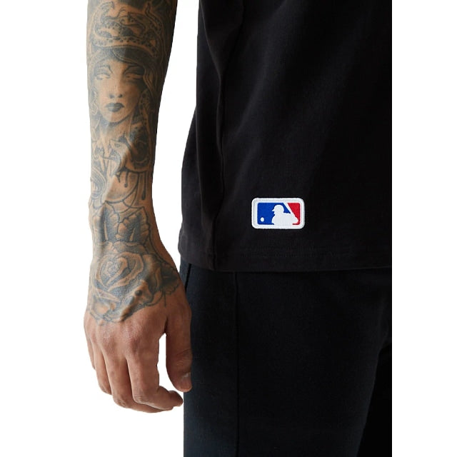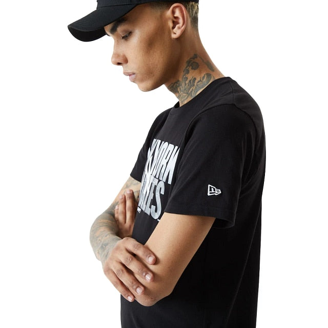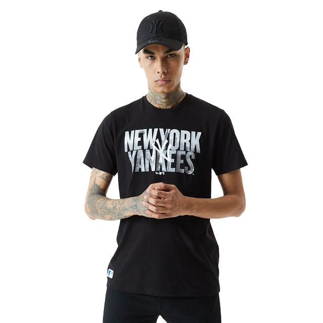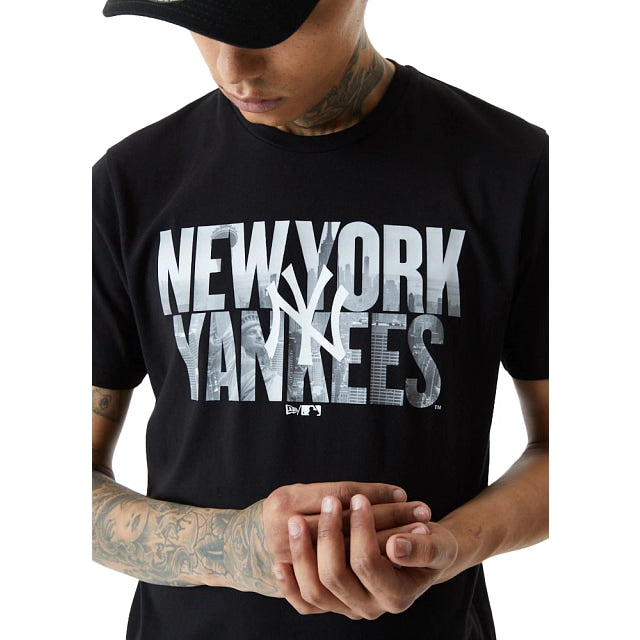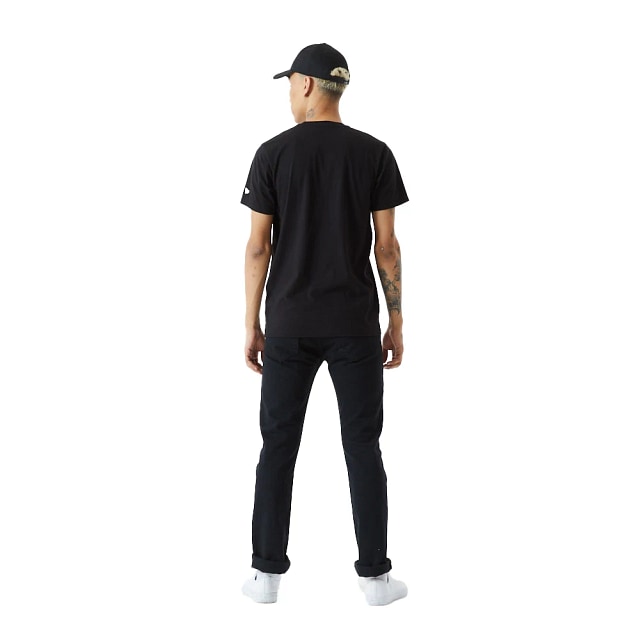 Playera New Era 100% de algodón con logotipo del equipo y estampado de la palabra con fondo fotográfico en el centro del frente, etiqueta de la liga tejida en el dobladillo derecho y bordado directo de la bandera de New Era en la manga izquierda.