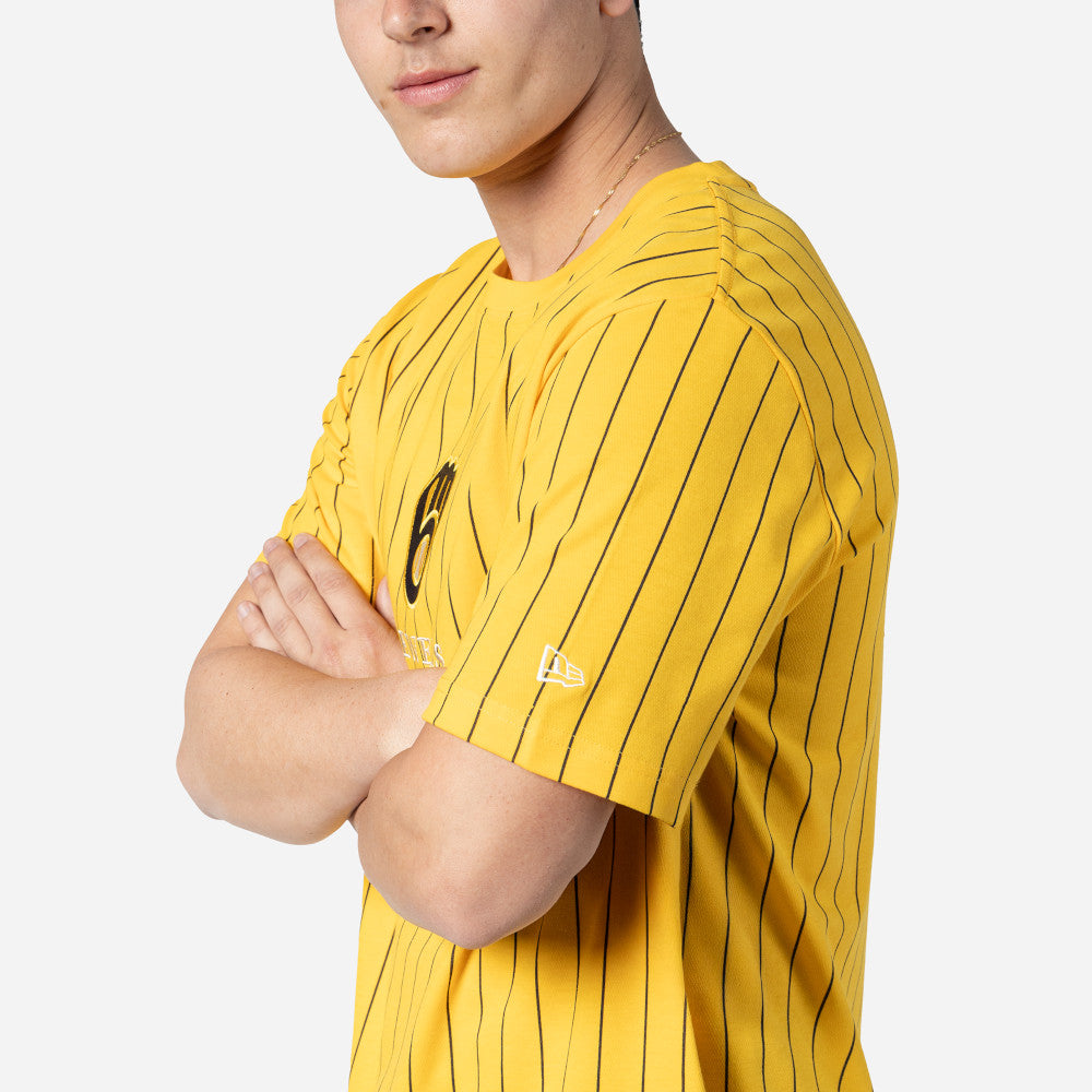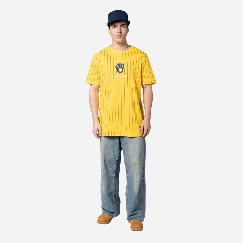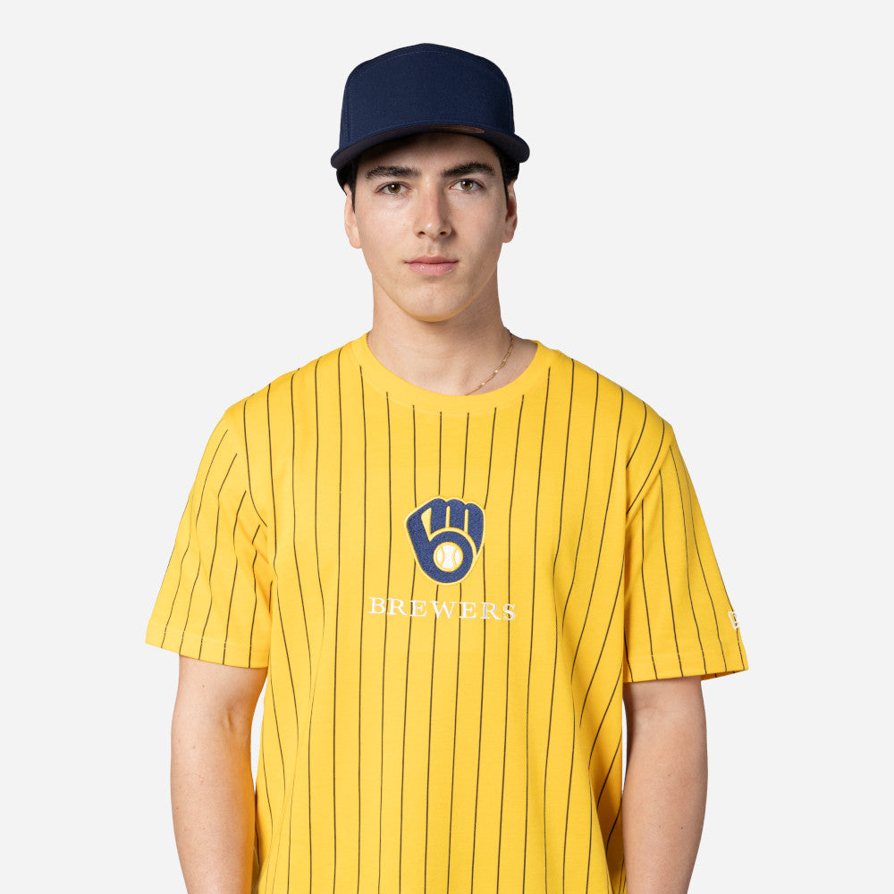 Esta Playera Manga Corta New Era de Milwaukee Brewers de la colección MLB Throwback presenta un diseño a rayas con el logotipo y nombre de los Brewers en la parte frontal y el flag de New Era bordado en la manga izquierda. Cómprala ya.