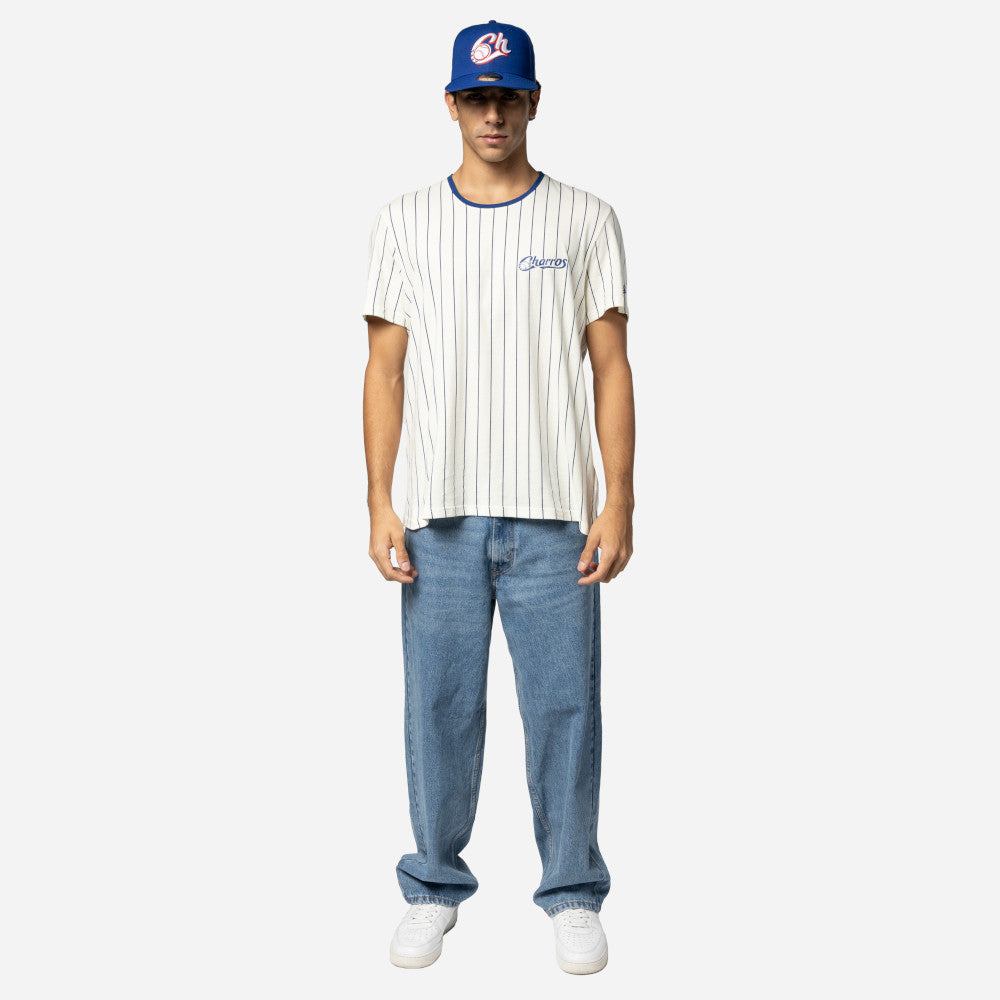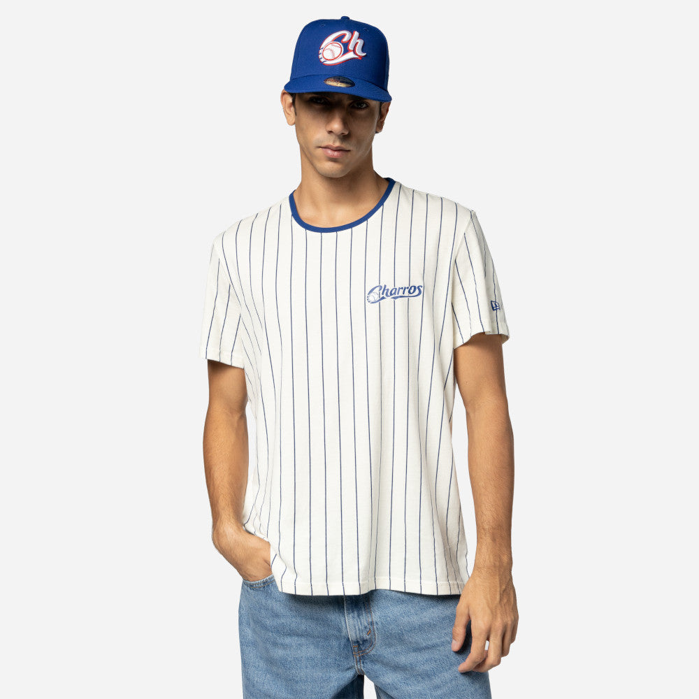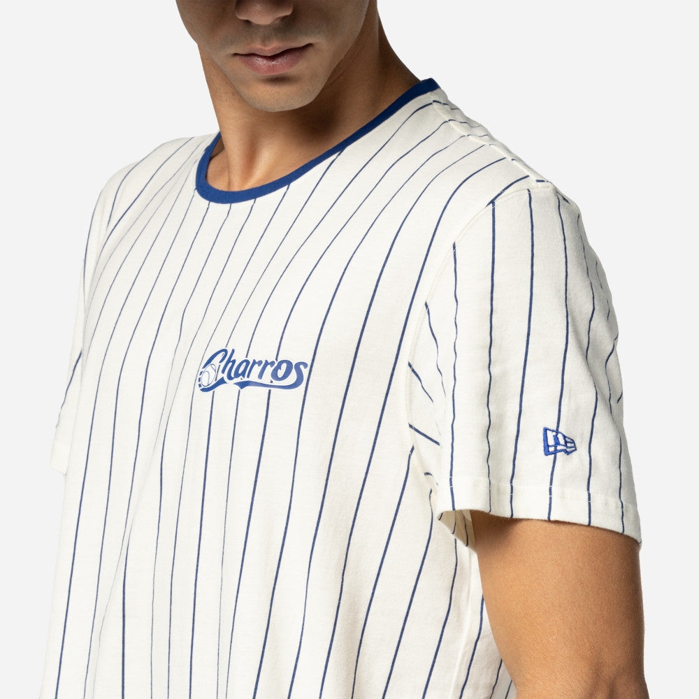 Esta Playera Manga Corta New Era de Charros de Jalisco de la colección LAMP Supernature presenta un diseño de rayas con el nombre de los Charros en la parte frontal izquierda y el flag de New Era bordado en la manga izquierda. Cómprala ya.