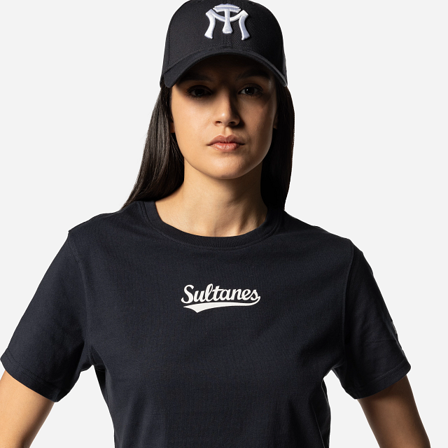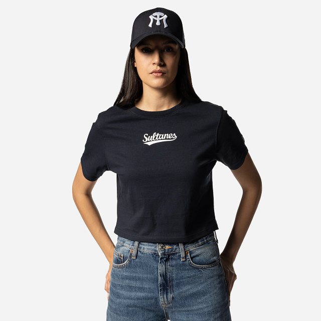 Apoya a tu equipo favorito con estilo con esta Playera Manga Corta para Mujer de Sultanes de Monterrey de la colección LMB Core que presenta un diseño tipo crop top unicolor con el nombre de Sultanes estampado en la parte de en frente, y el flag de New Era bordado en la manga izquierda. ¡No te quedes fuera del diamante y cómprala ya!