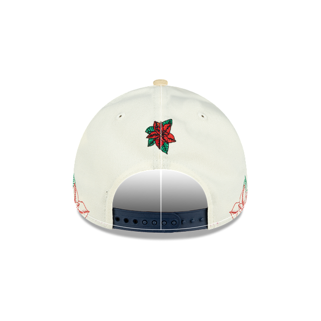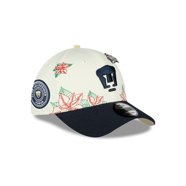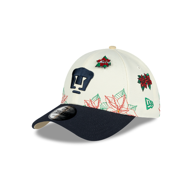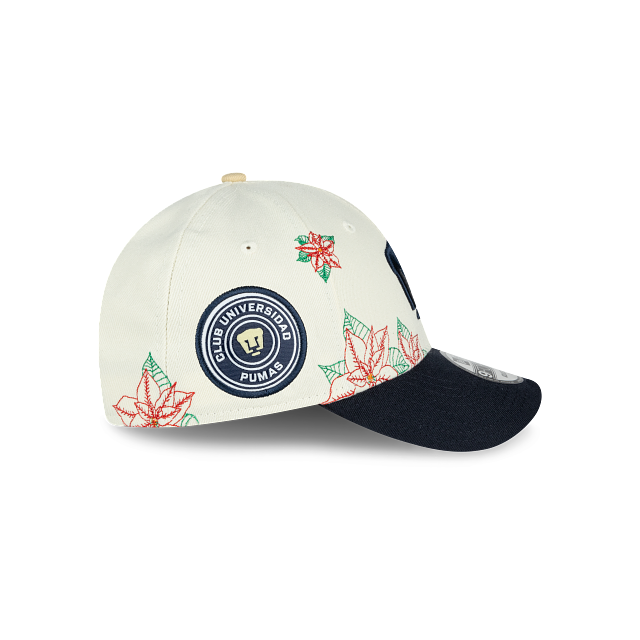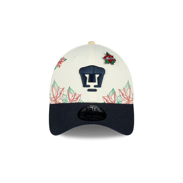Esta gorra curva New Era 9FORTY de Pumas de la colección Futbol Mexicano Nochebuena presenta un diseño con el logotipo de los Pumas bordado en los paneles frontales junto con un pin en forma de flor de nochebuena, hojas de nochebuena en toda la corona, un parche representativo del equipo del lado derecho y el flag de New Era bordado del lado izquierdo. Cómprala ya.