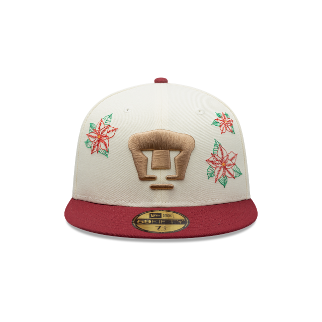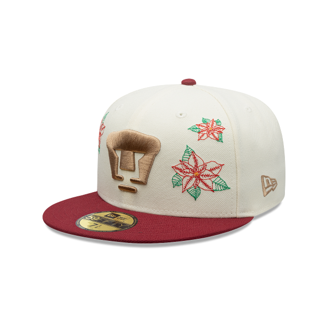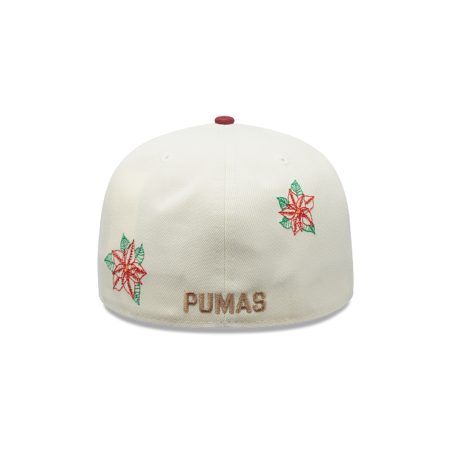 Esta gorra plana New Era 59FIFTY de Pumas de la colección LMX Nochebuena presenta un diseño con flores de nochebuena bordadas en la corona, el logotipo de los Pumas bordado en los paneles frontales, el nombre del equipo en la parte de atrás y el flag de New Era bordado del lado izquierdo. Cómprala ya.