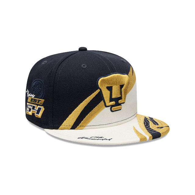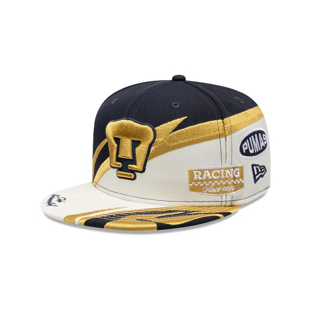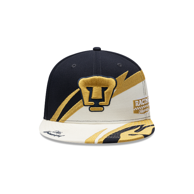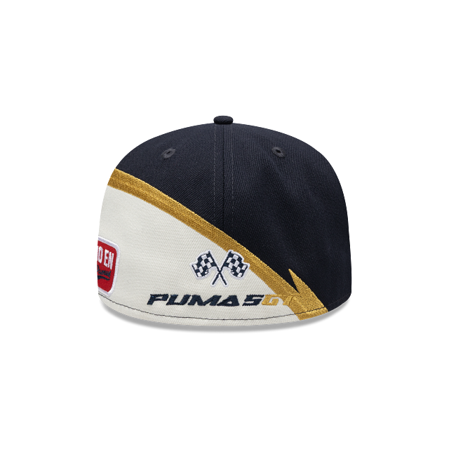 Esta gorra plana New Era 59FIFTY de Pumas de la colección Futbol Mexicano Racing presenta un diseño inspirado en el deporte motor con el logotipo de los Pumas bordado en los paneles frontales, parches alusivos al automóvilismo en la corona, sweatband con patrón de bandera a cuadros y el flag de New Era bordado del lado izquierdo. Cómprala ya.